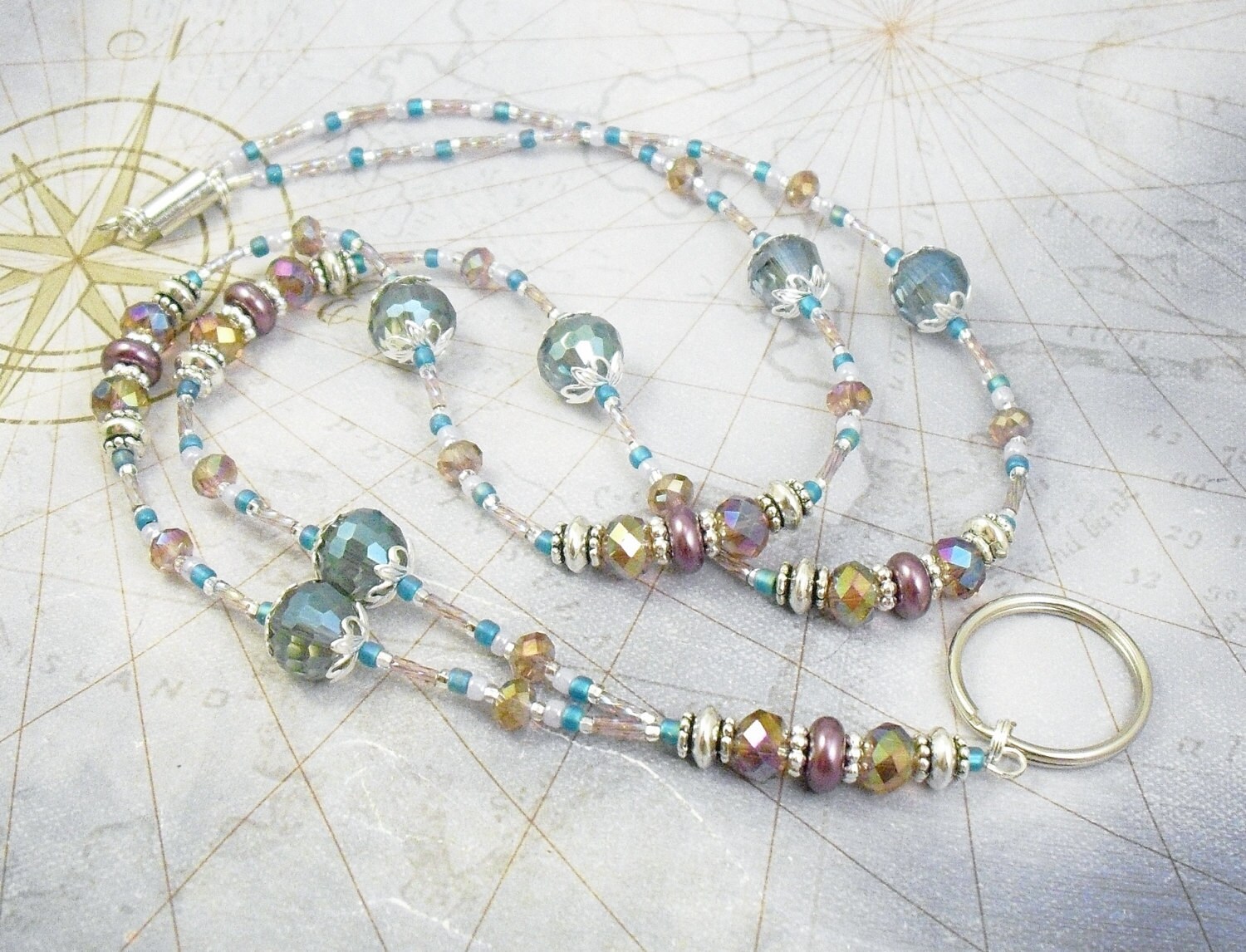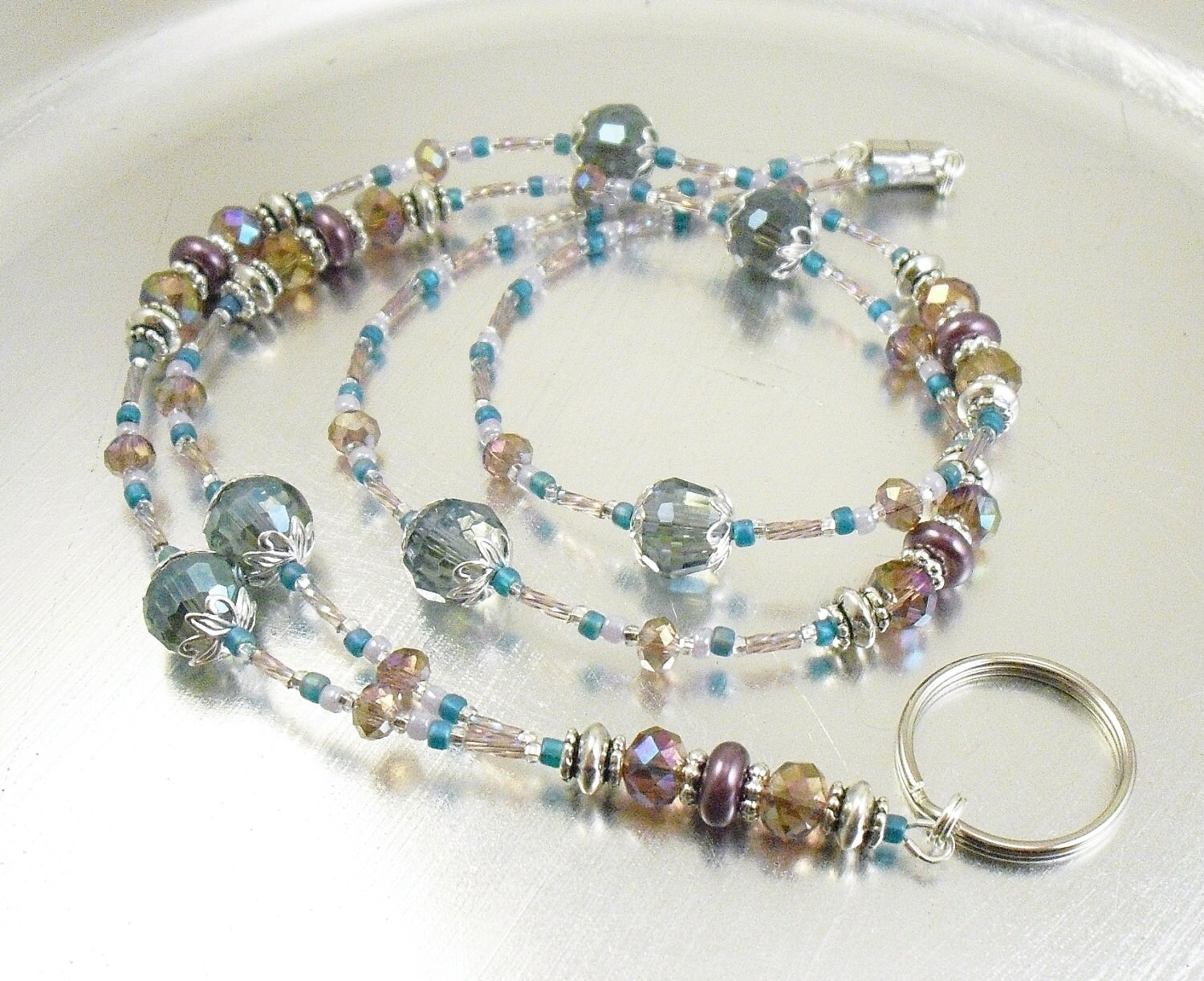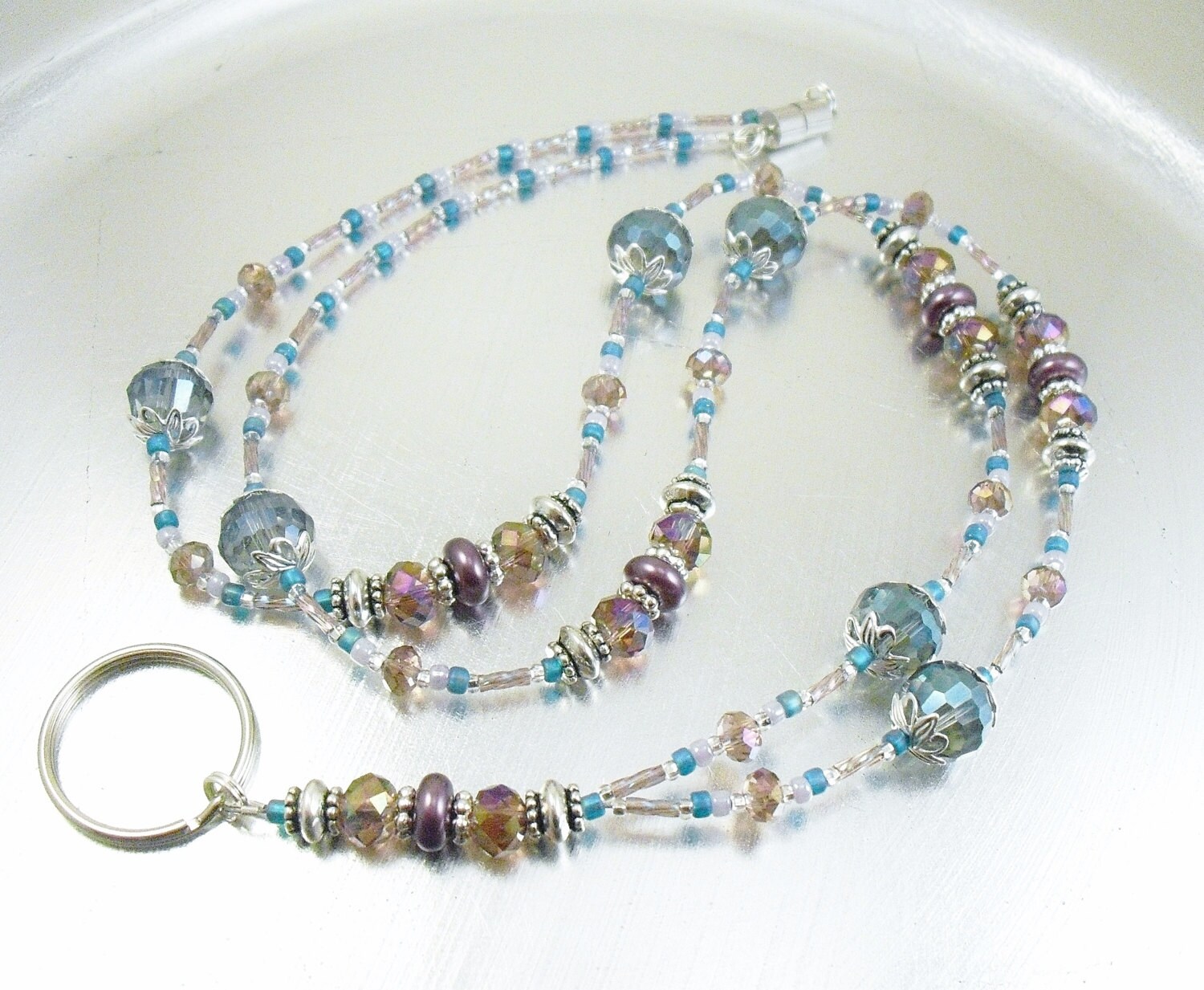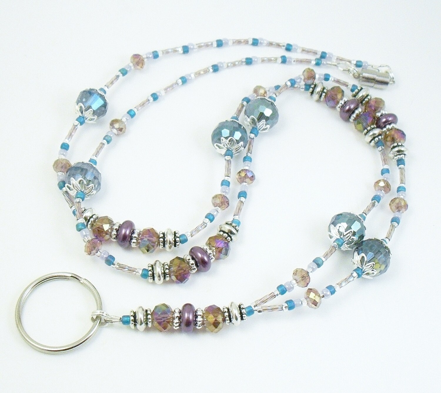 Give as a gift or keep for yourself! This ID lanyard is beautifully elegant and will go with many items in your wardrobe. Made with 8x3mm rondelle shaped violet glass pearls, 6mm and 8mm rondelle shaped faceted amethyst crystal glass, 10mm round blue faceted crystal glass, 3mm lilac Ceylon glass beads, 3mm turquoise glass beads, tiny silver lined clear glass seed beads, light purple irridescent rainbow twisted bugle beads, and silver plated spacers and bead caps.
