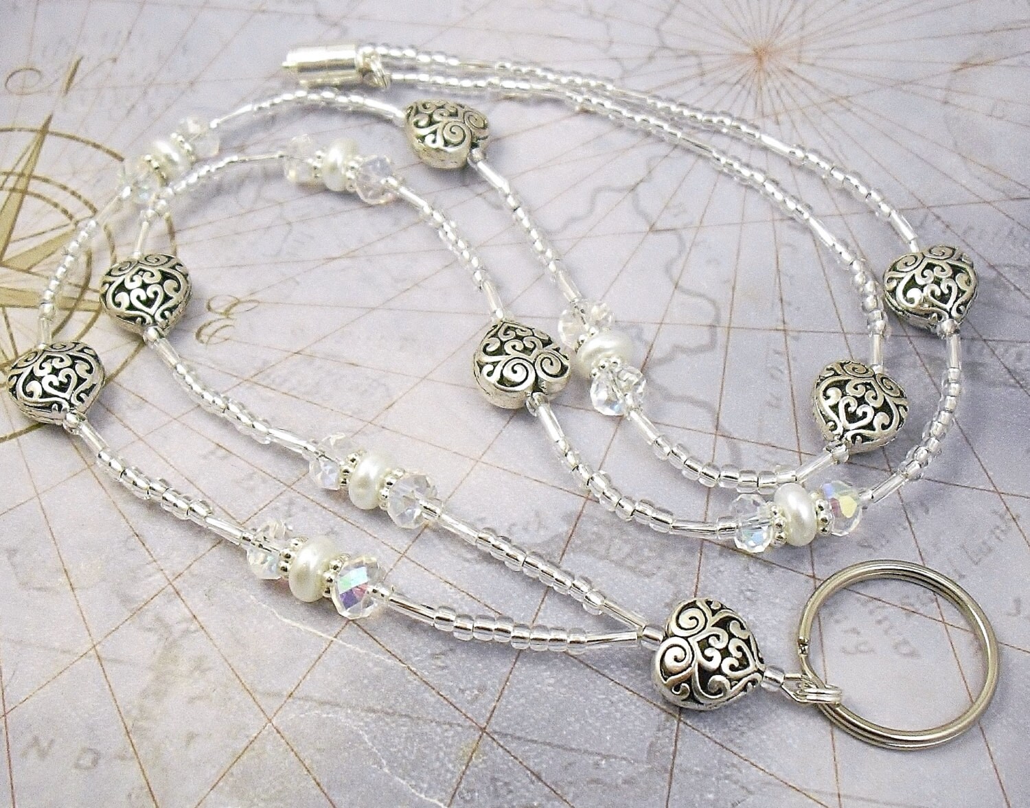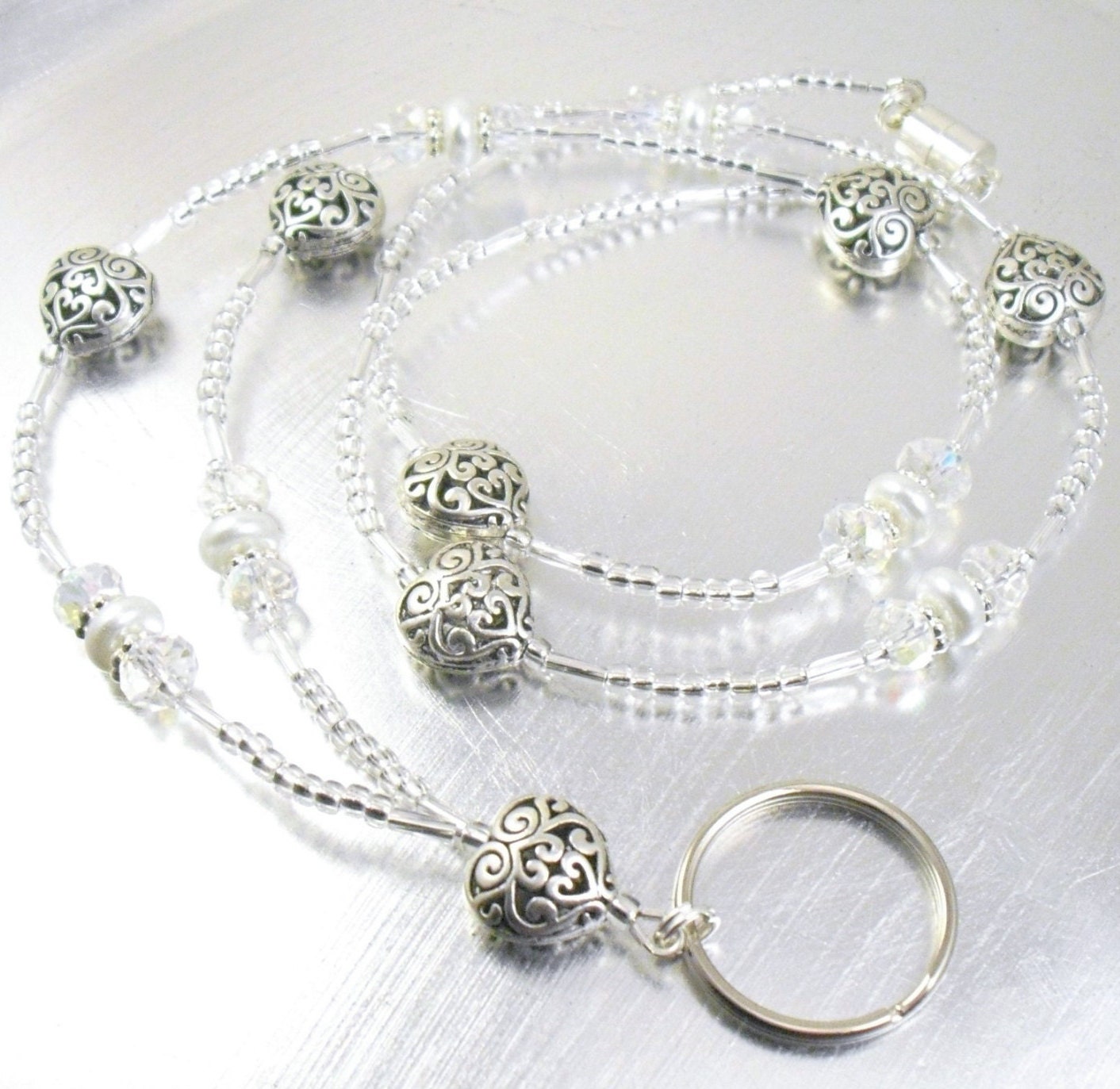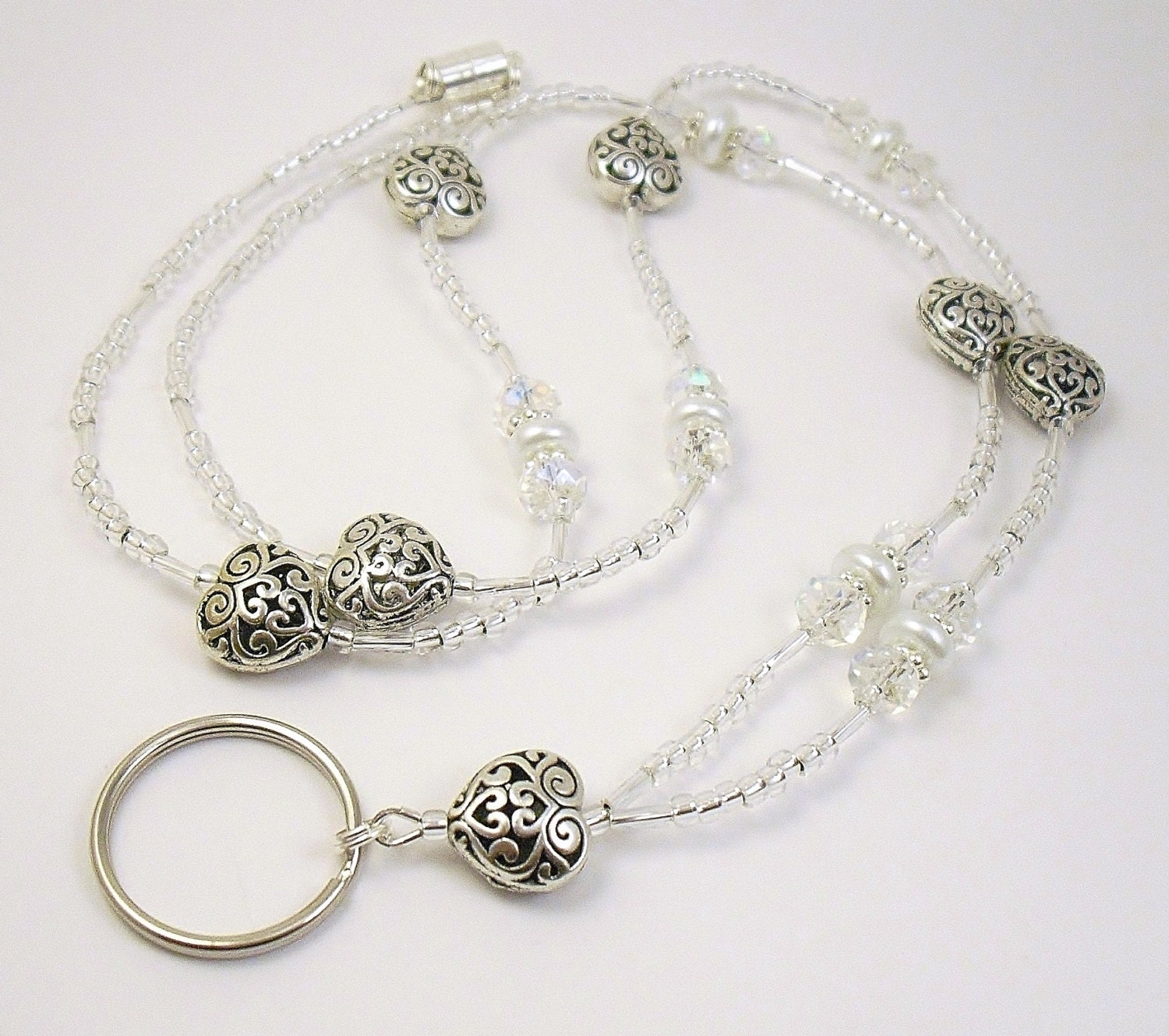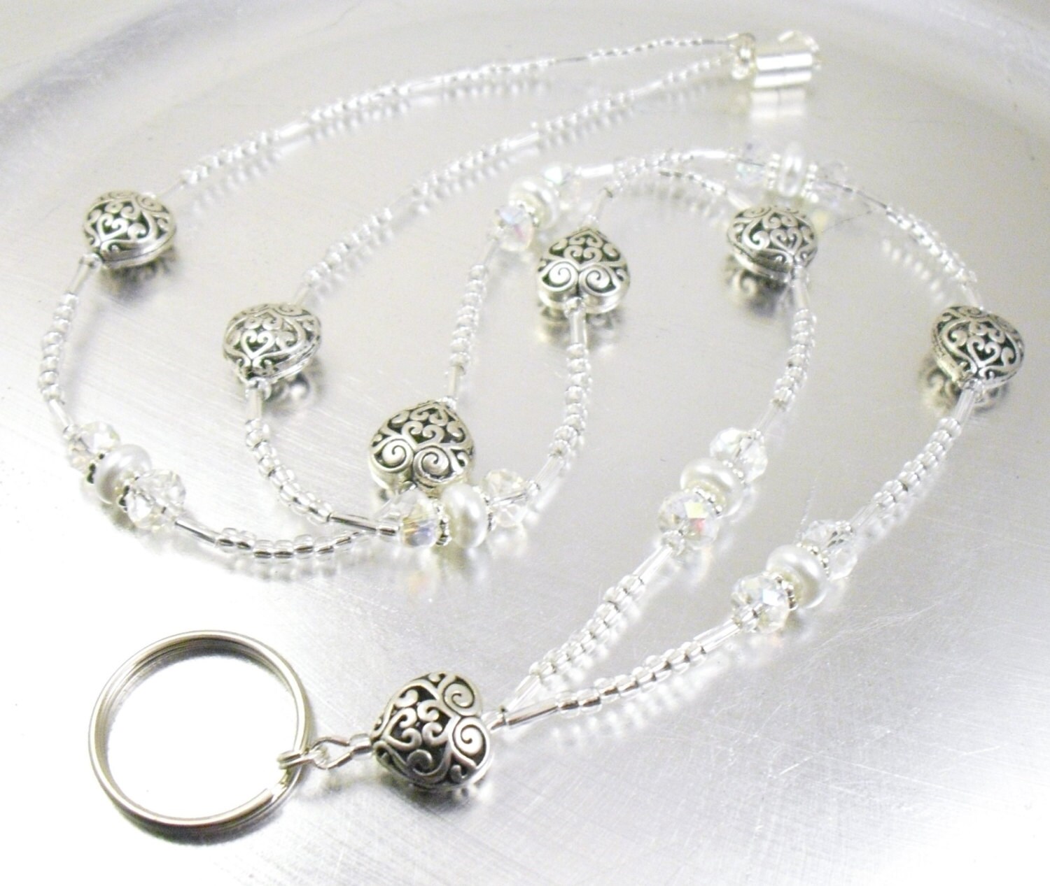 This cute and sparkly lanyard is made with 14mm scrolled metal hearts, 8x4mm crystal aurora borealis glass rondelle shaped glass, 8x3mm white glass pearls, clear silver foiled twisted bugle beads, 2mm silver foiled clear glass beads and silver plated spacers.