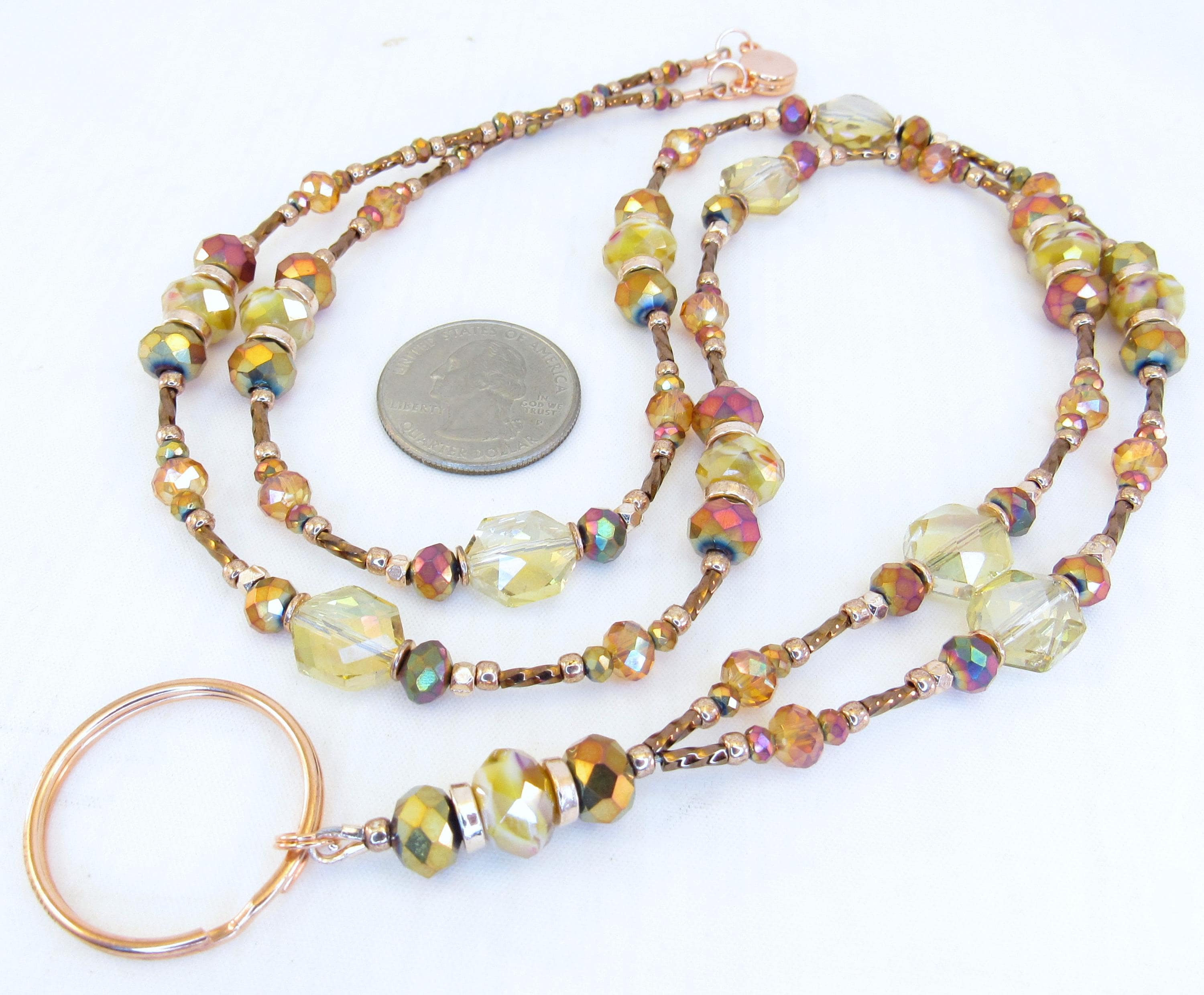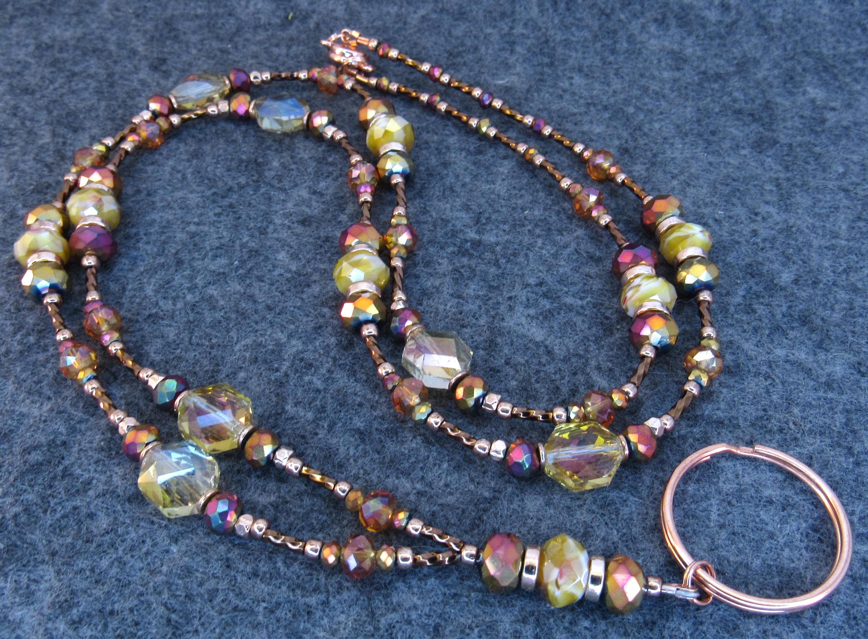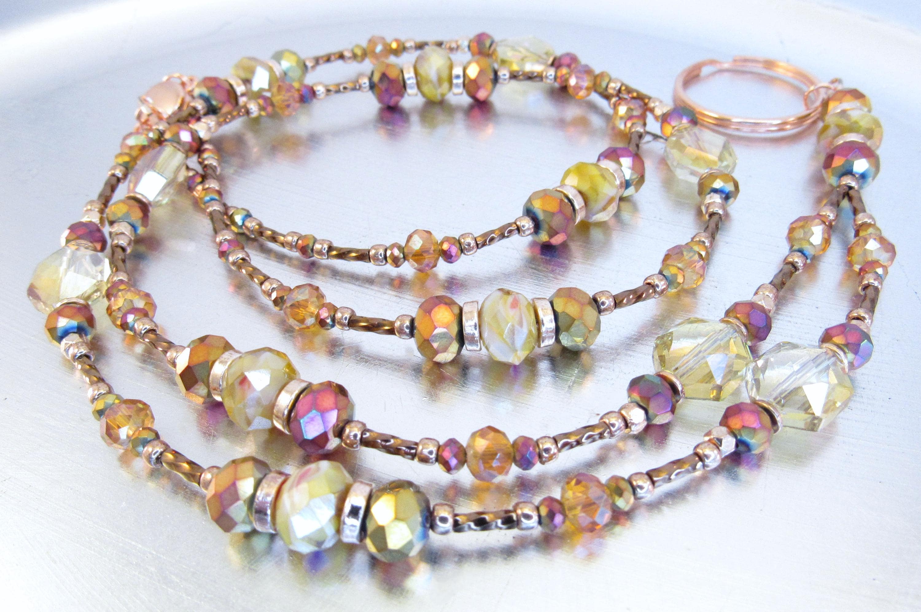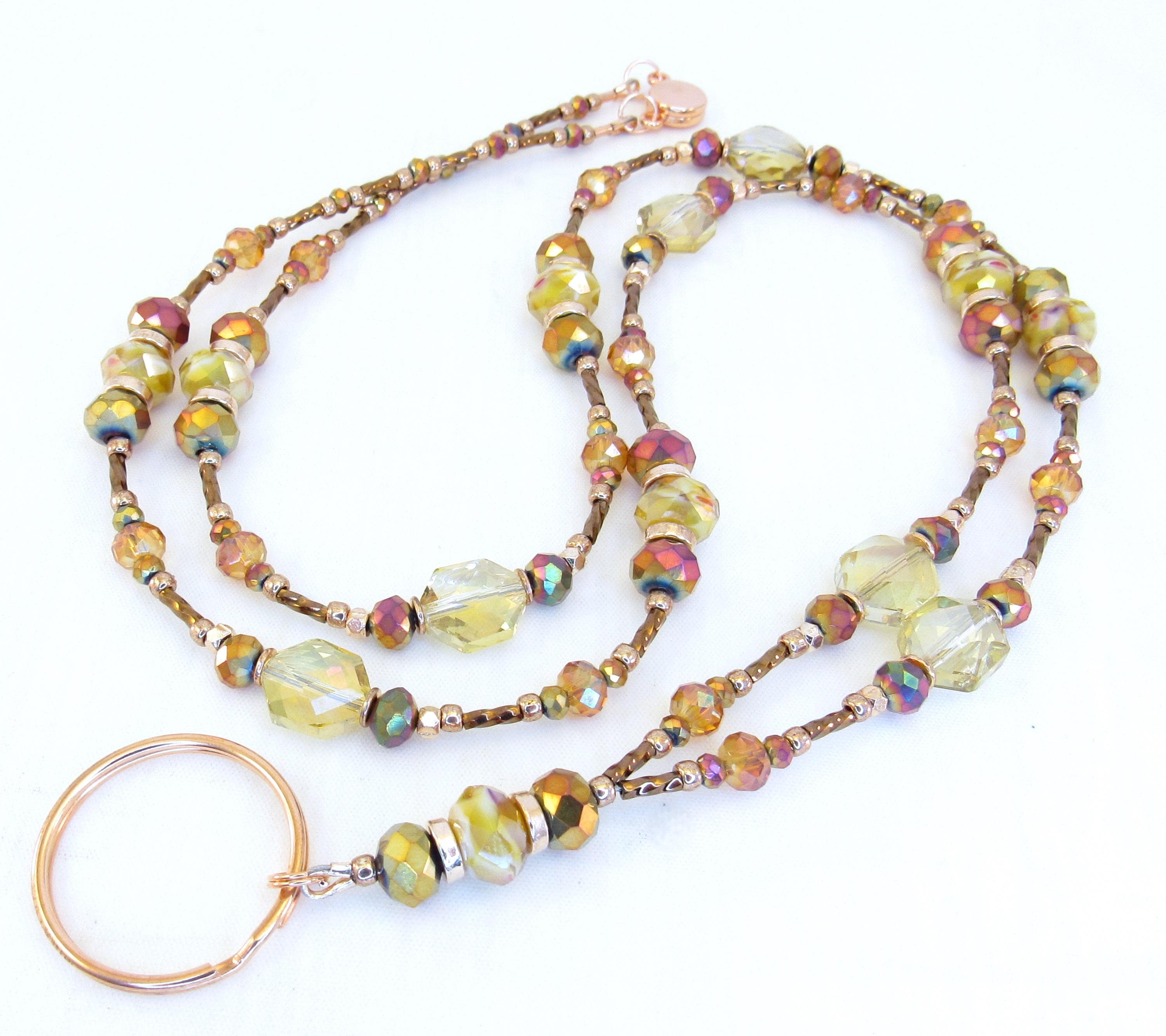 This gorgeous, sparkling ID lanyard is beautifully unique! Made with 9x6mm amber crystal glass, 8mm and 3mm faceted metallic rainbow glass, 6mm faceted orange crystal glass, 10x12mm gold faceted octagon crystal glass, bronze glass seed beads, 6mm metallic brown spiral glass bugle beads, and rose gold spacers and findings.