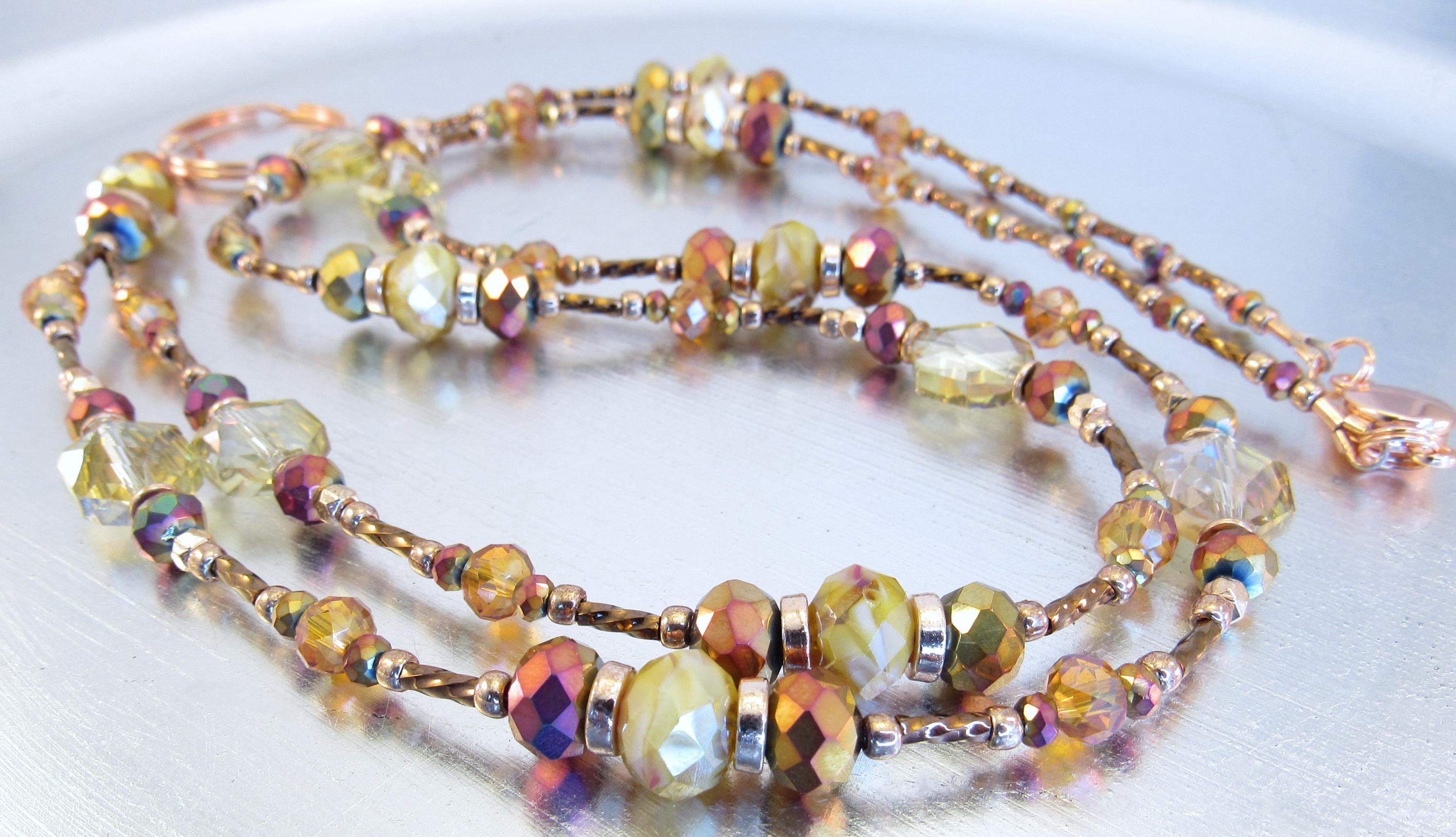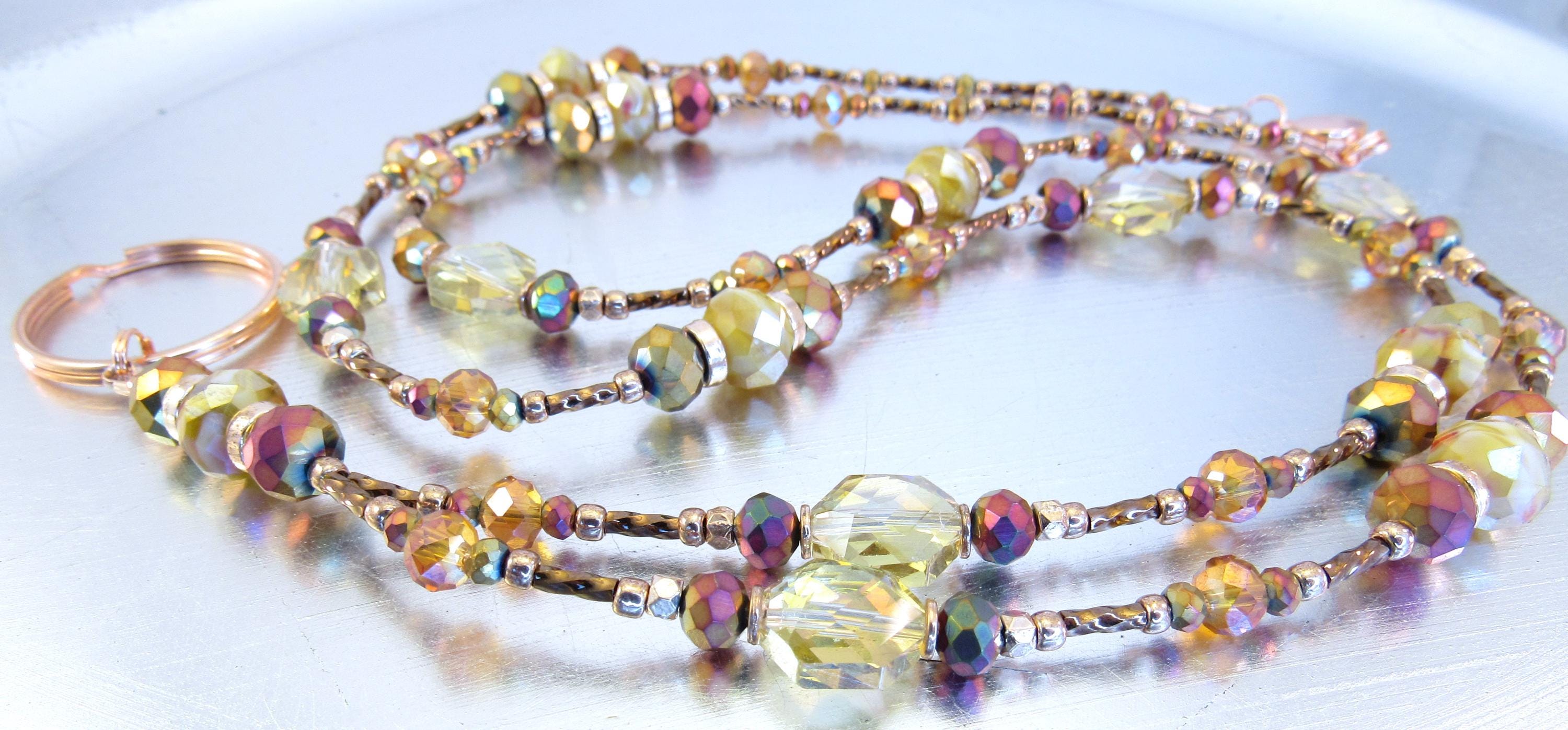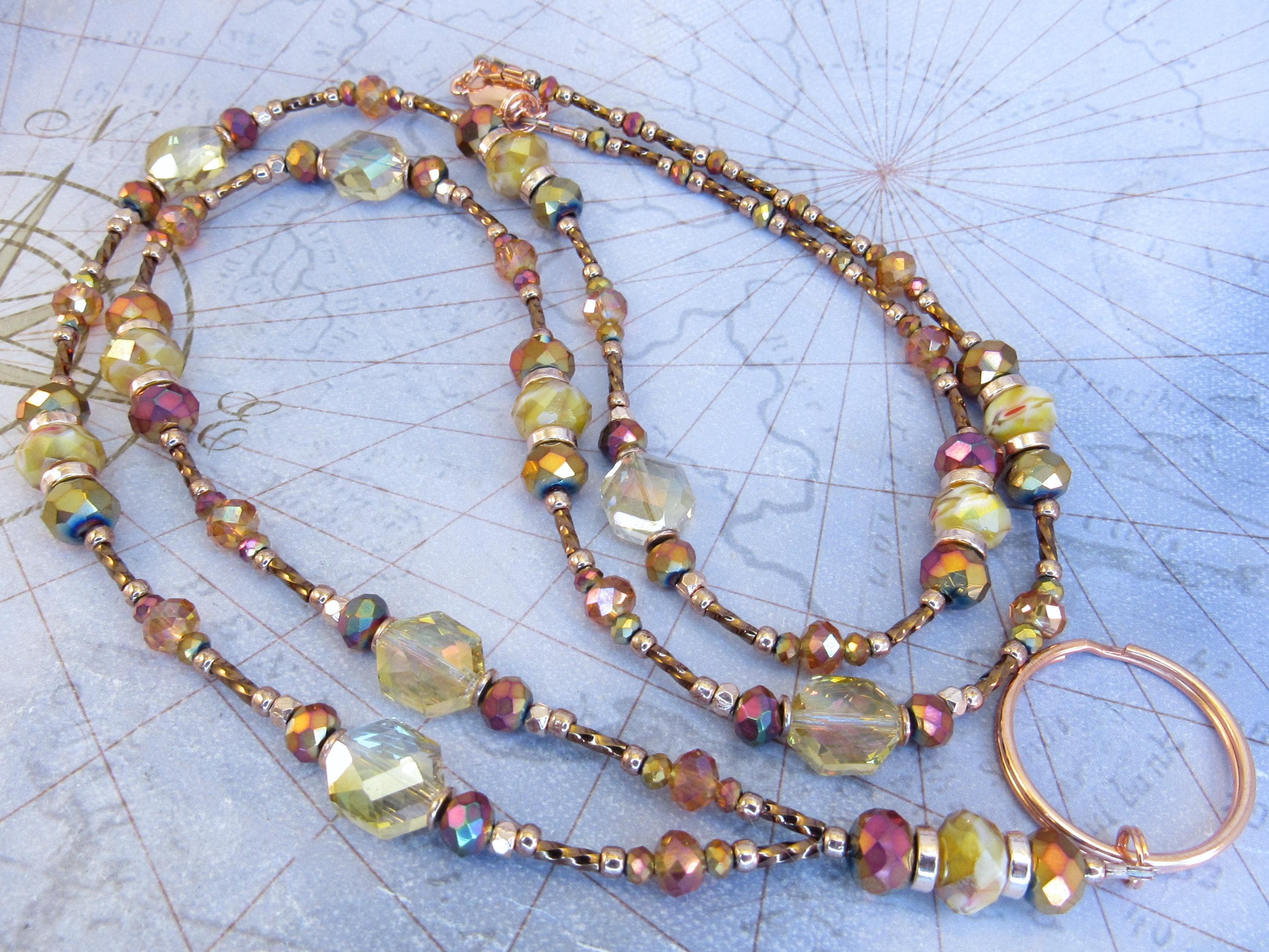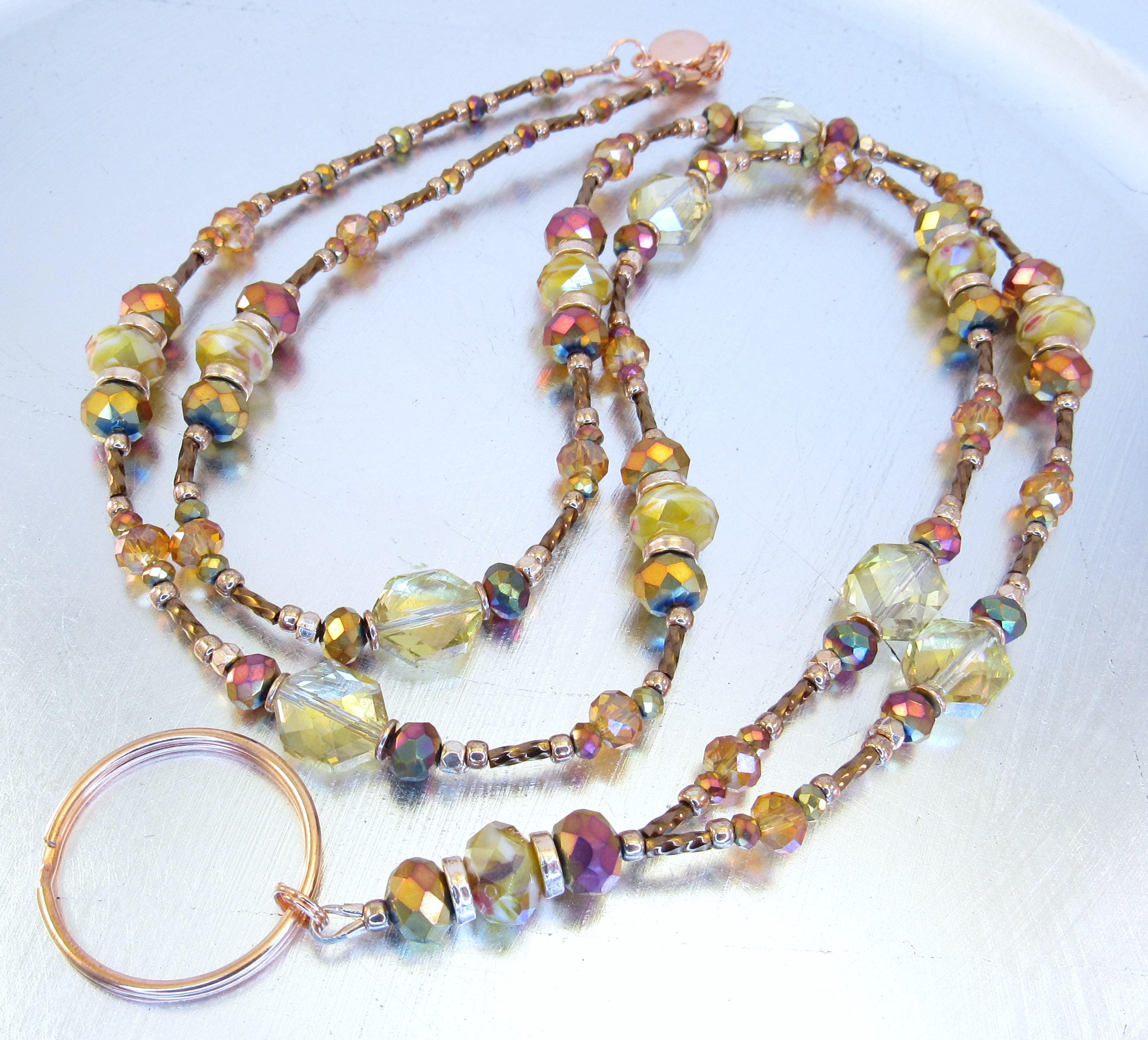 This gorgeous, sparkling ID lanyard is beautifully unique! Made with 9x6mm amber crystal glass, 8mm and 3mm faceted metallic rainbow glass, 6mm faceted orange crystal glass, 10x12mm gold faceted octagon crystal glass, bronze glass seed beads, 6mm metallic brown spiral glass bugle beads, and rose gold spacers and findings.
