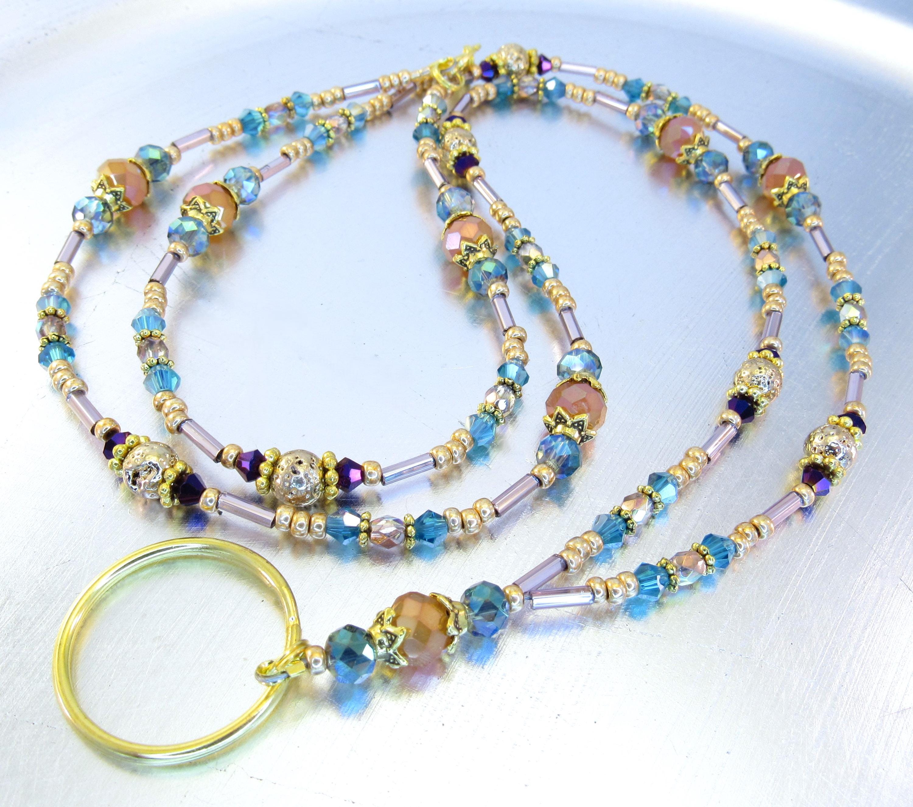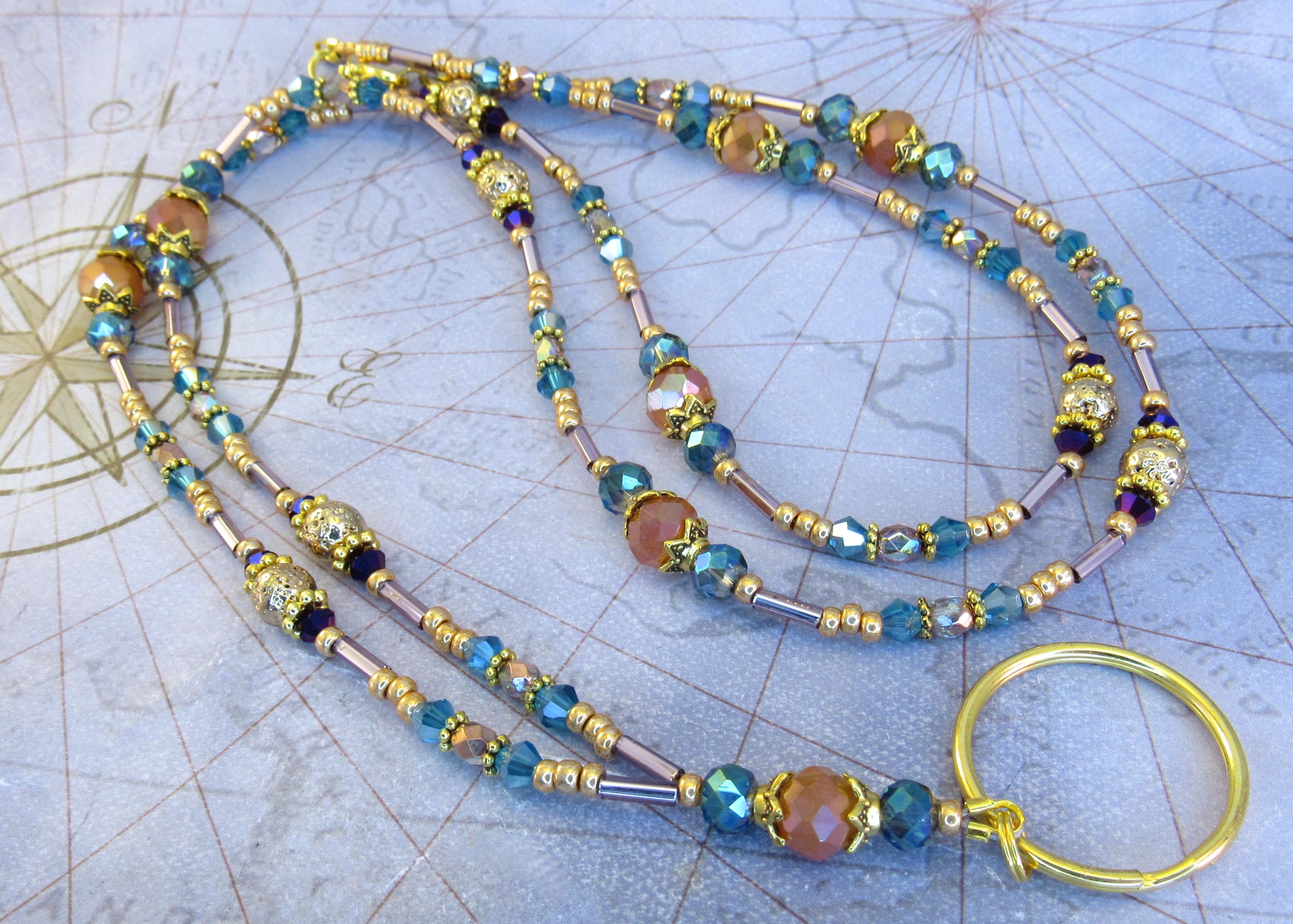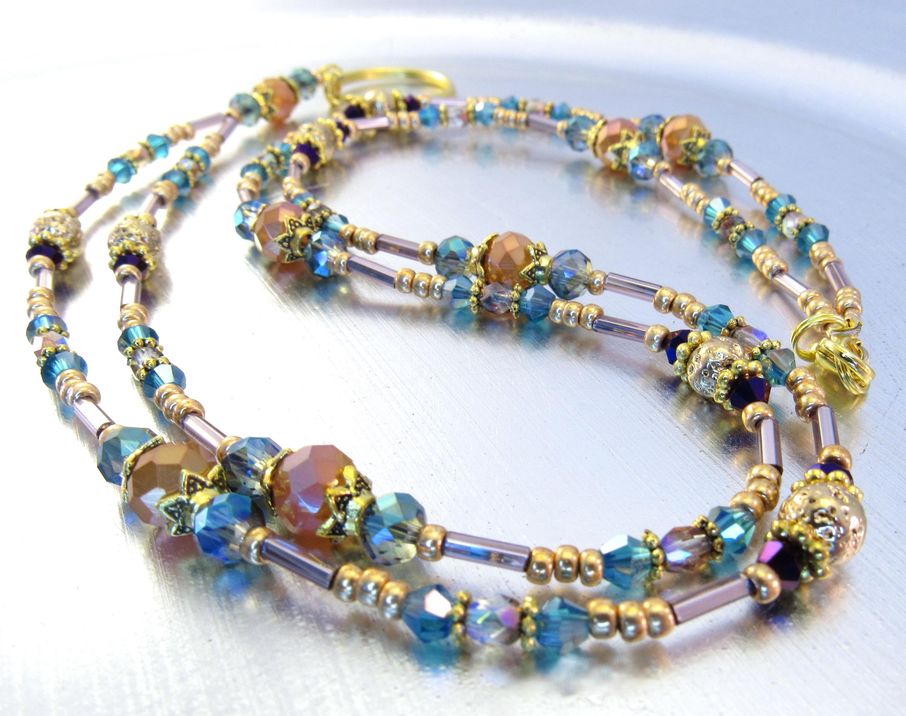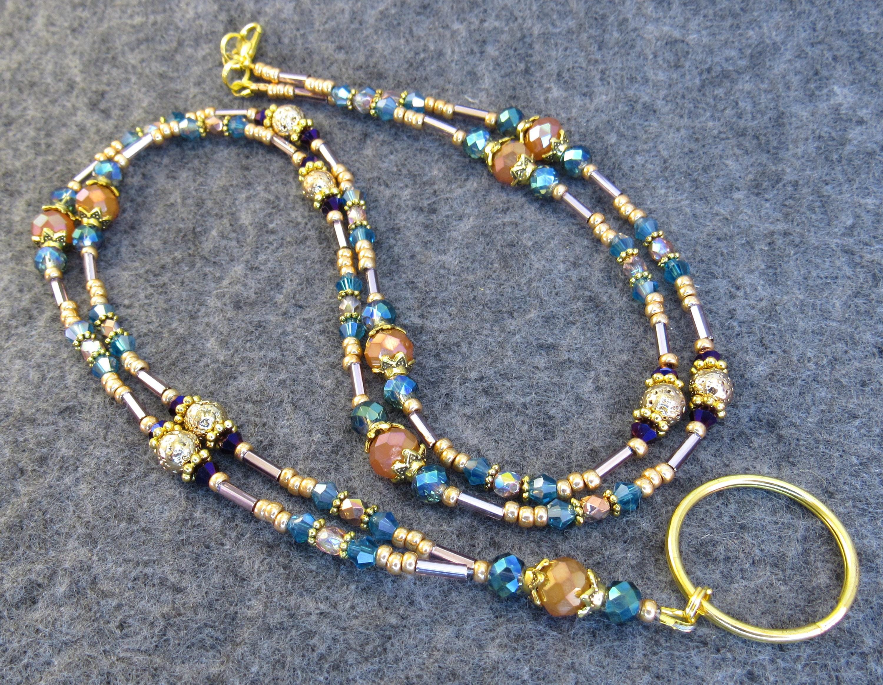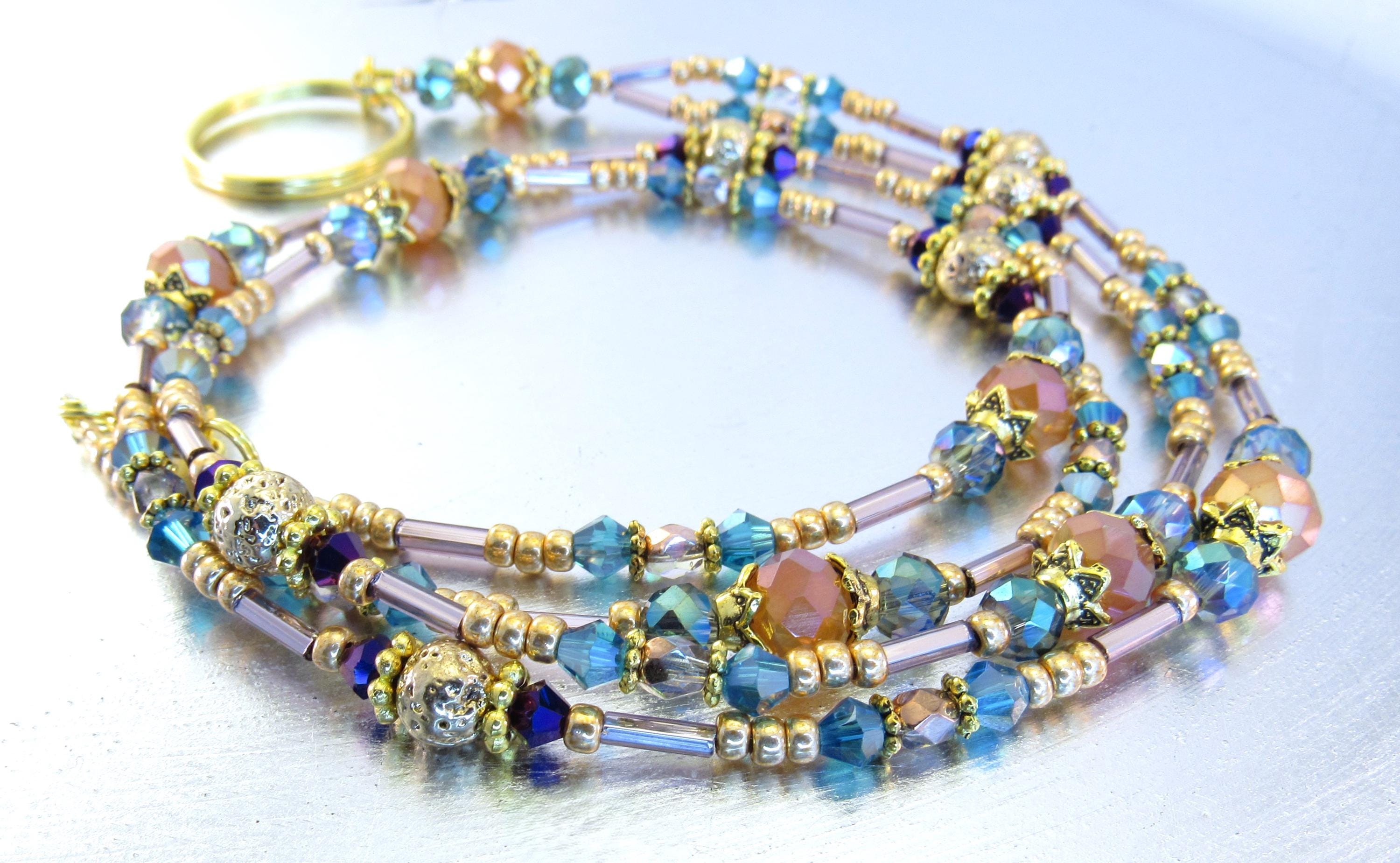I made this bright and elegant lanyard with sparkling 6x8mm faceted rondelle shaped mango crystal glass beads, 6mm dark blue faceted crystal glass, 4mm aquamarine and 4mm purple bicone crystal, 8mm lava gold beads, gold plated bead caps, gold glass bugle bead and metallic gold glass seed beads. Very light and easy to wear, simply gorgeous!