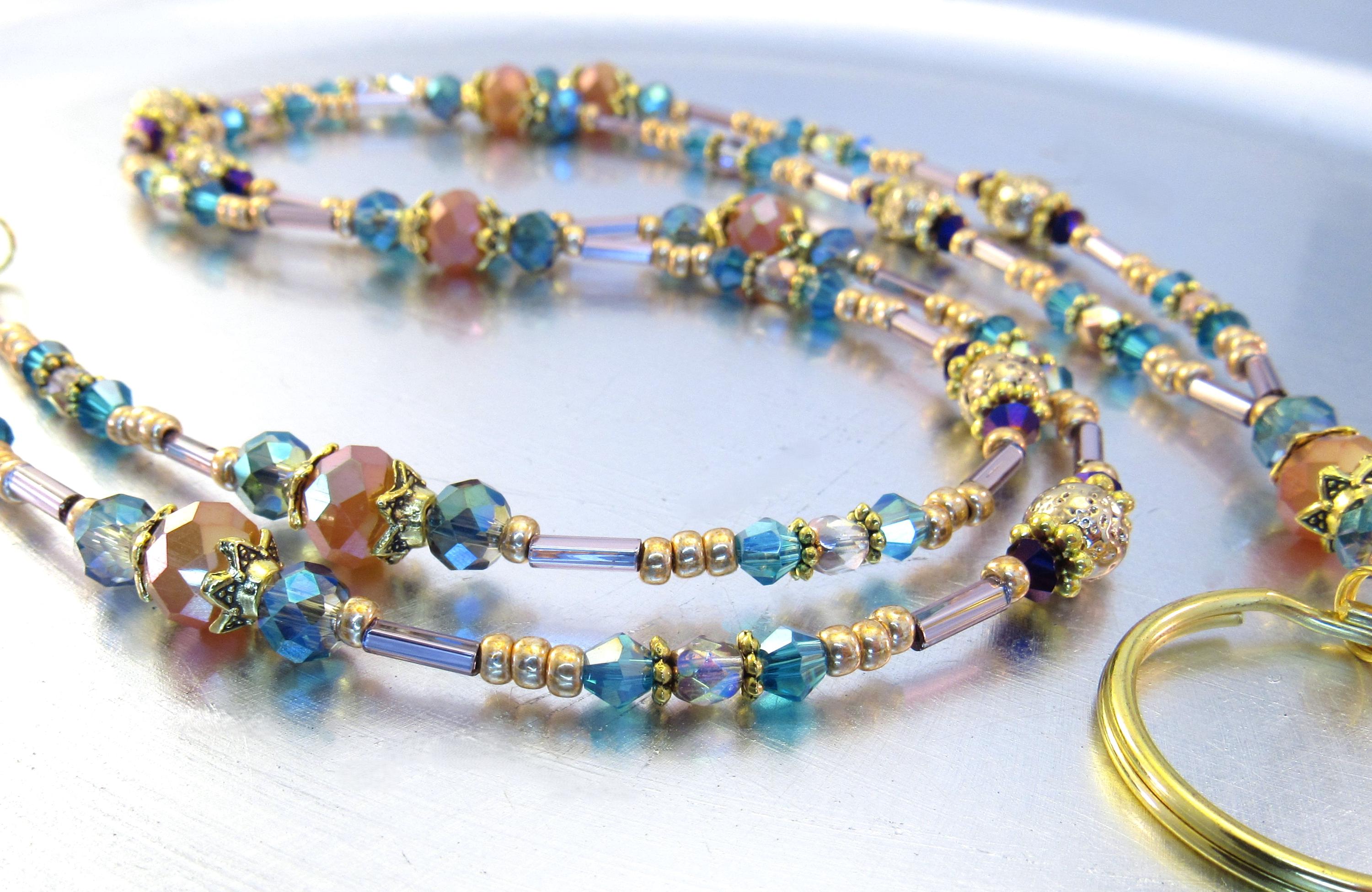 This lanyard is a nice length, about 32 1/2" long from end to end with another 2" where the focal beads and split ring fall (or about 18 1/2" from the back of the neck to the bottom of the key ring). You can add keys, charms and connect other attachments for your ID badge.