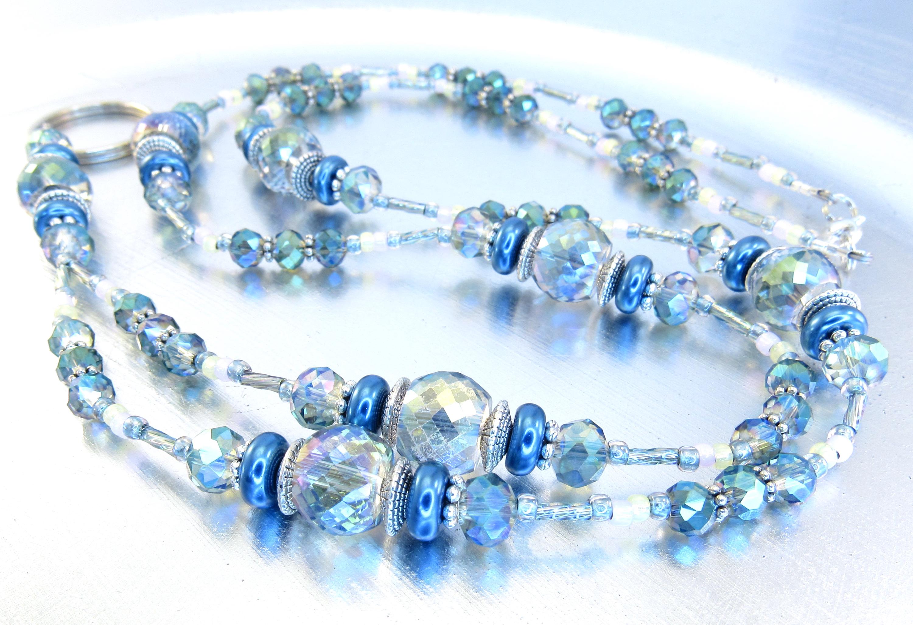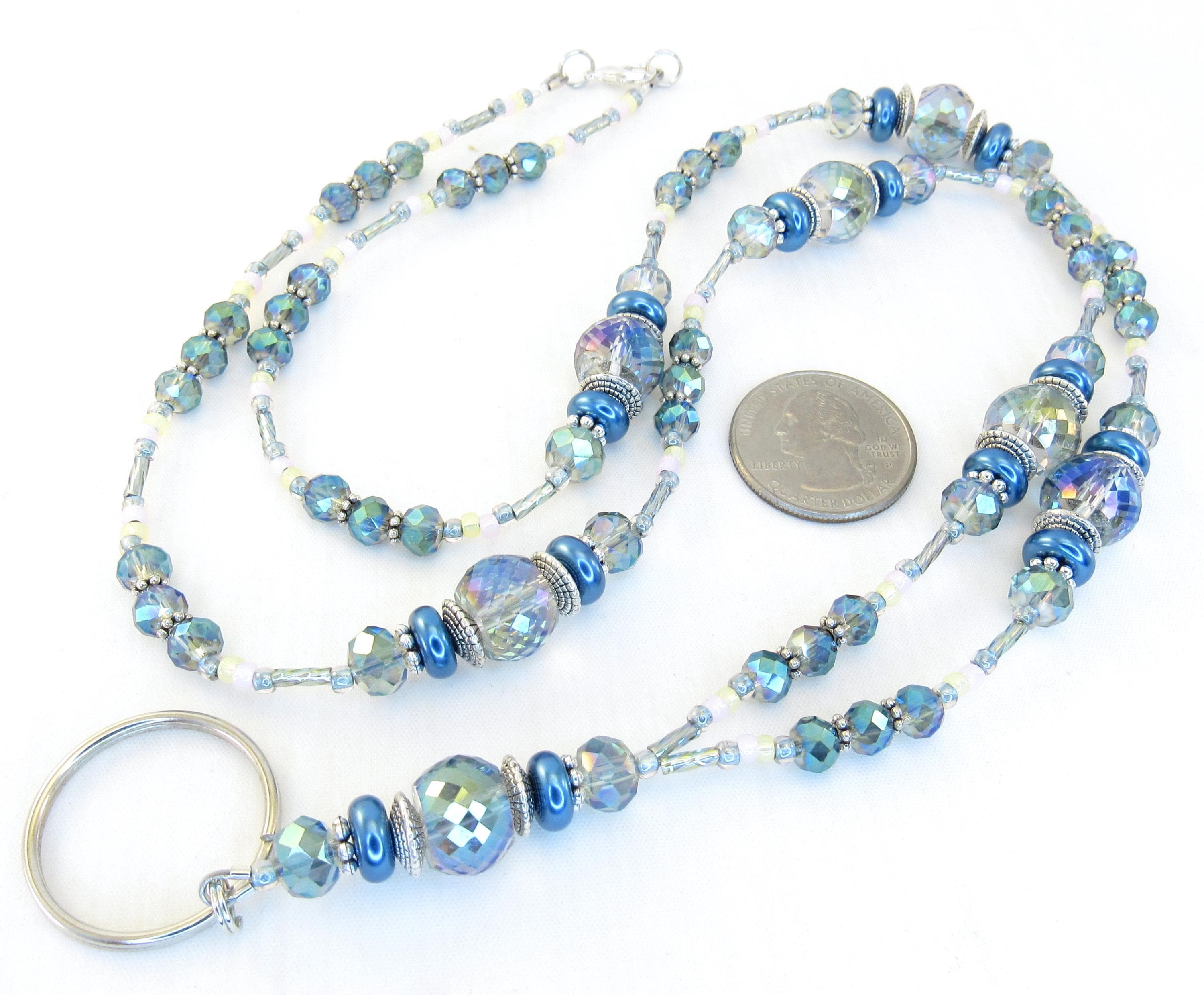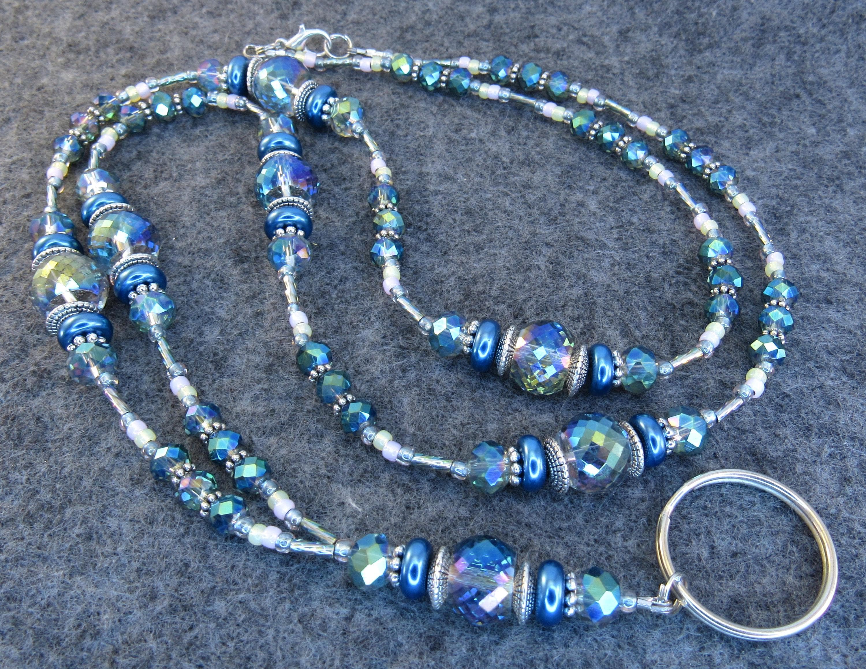 This is a stunning, sparkling ID lanyard that will compliment many outfits in your wardrobe. I made it with a mix of beautiful beads including faceted rotund 12mm aqua crystal glass beads, 8x4mm blue glass pearls, 8mm and 6mm faceted blue crystal glass beads, silver plated spacers, pastel pink and yellow and denim blue glass seed beads and gunmetal blue rainbow twisted glass bugle beads.