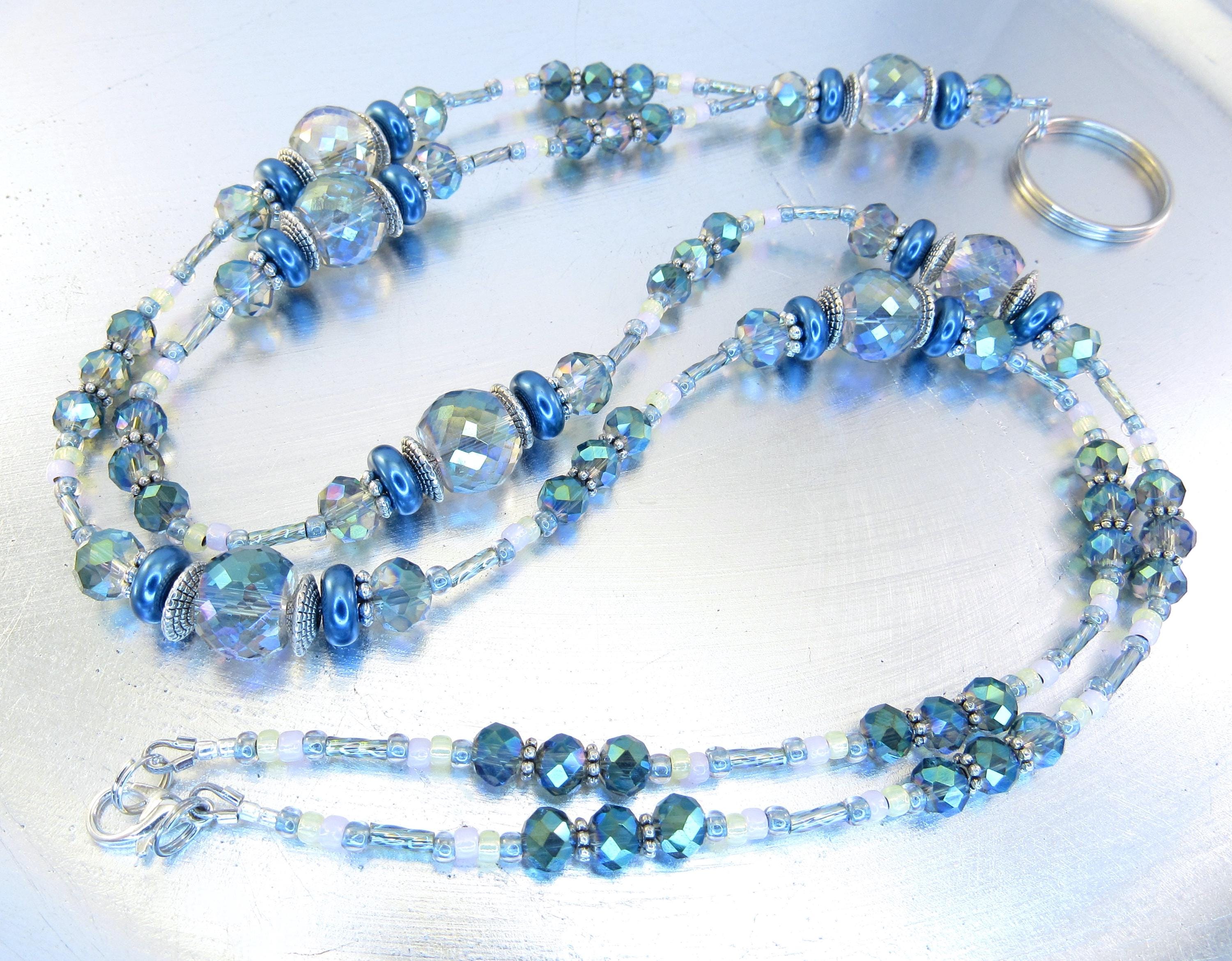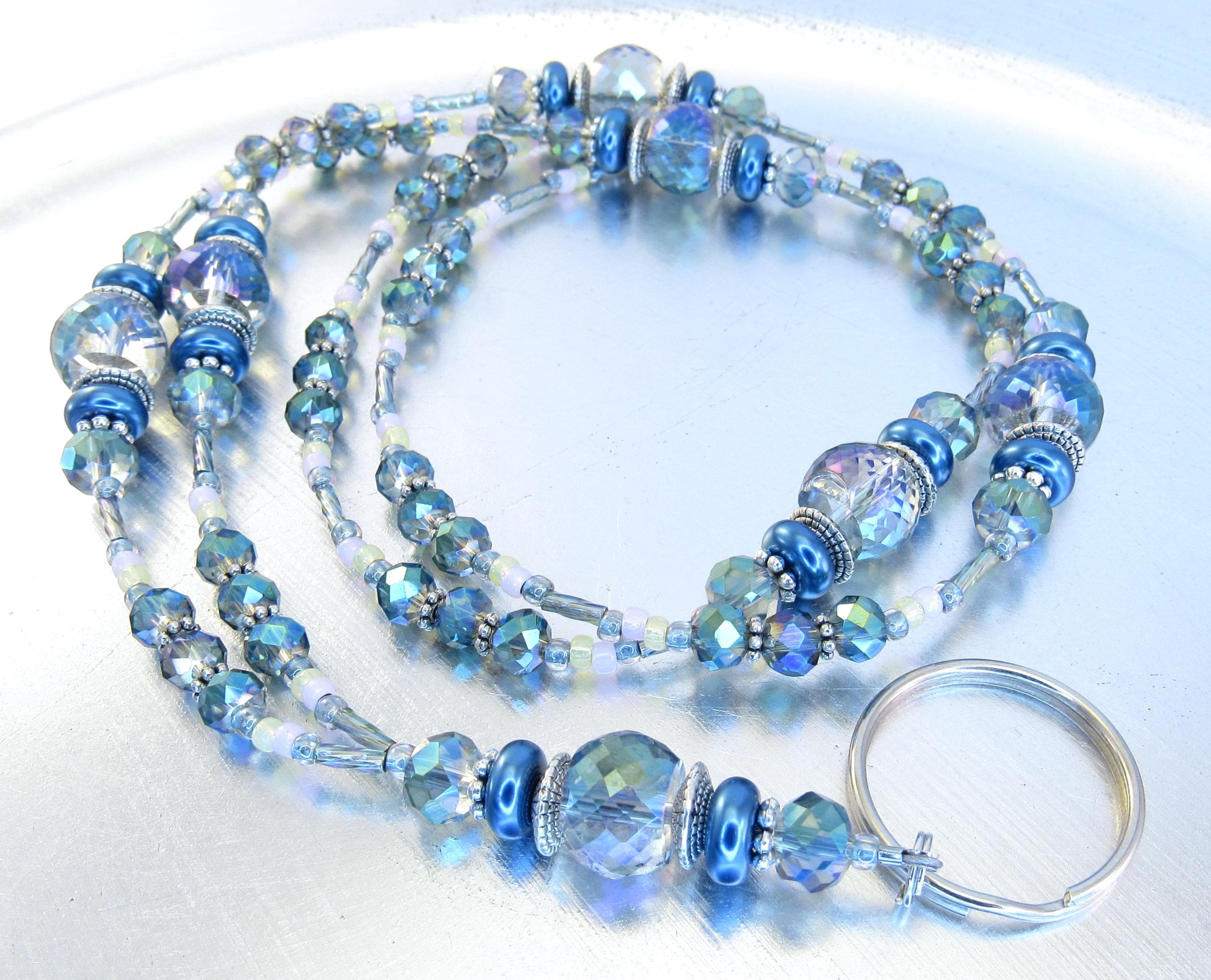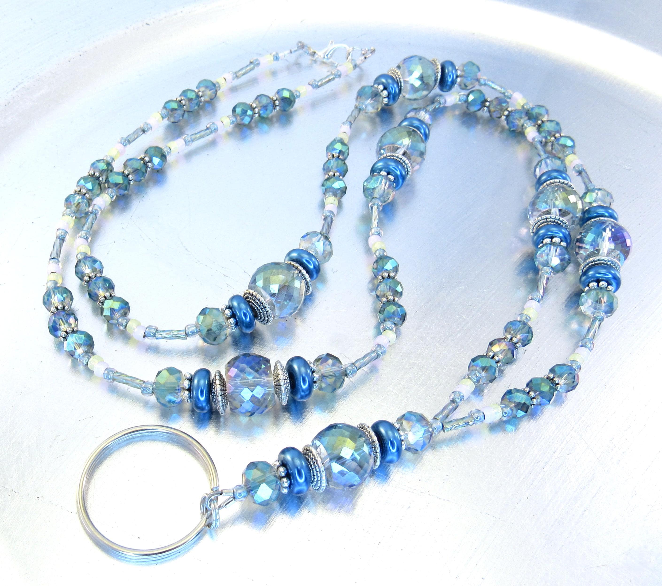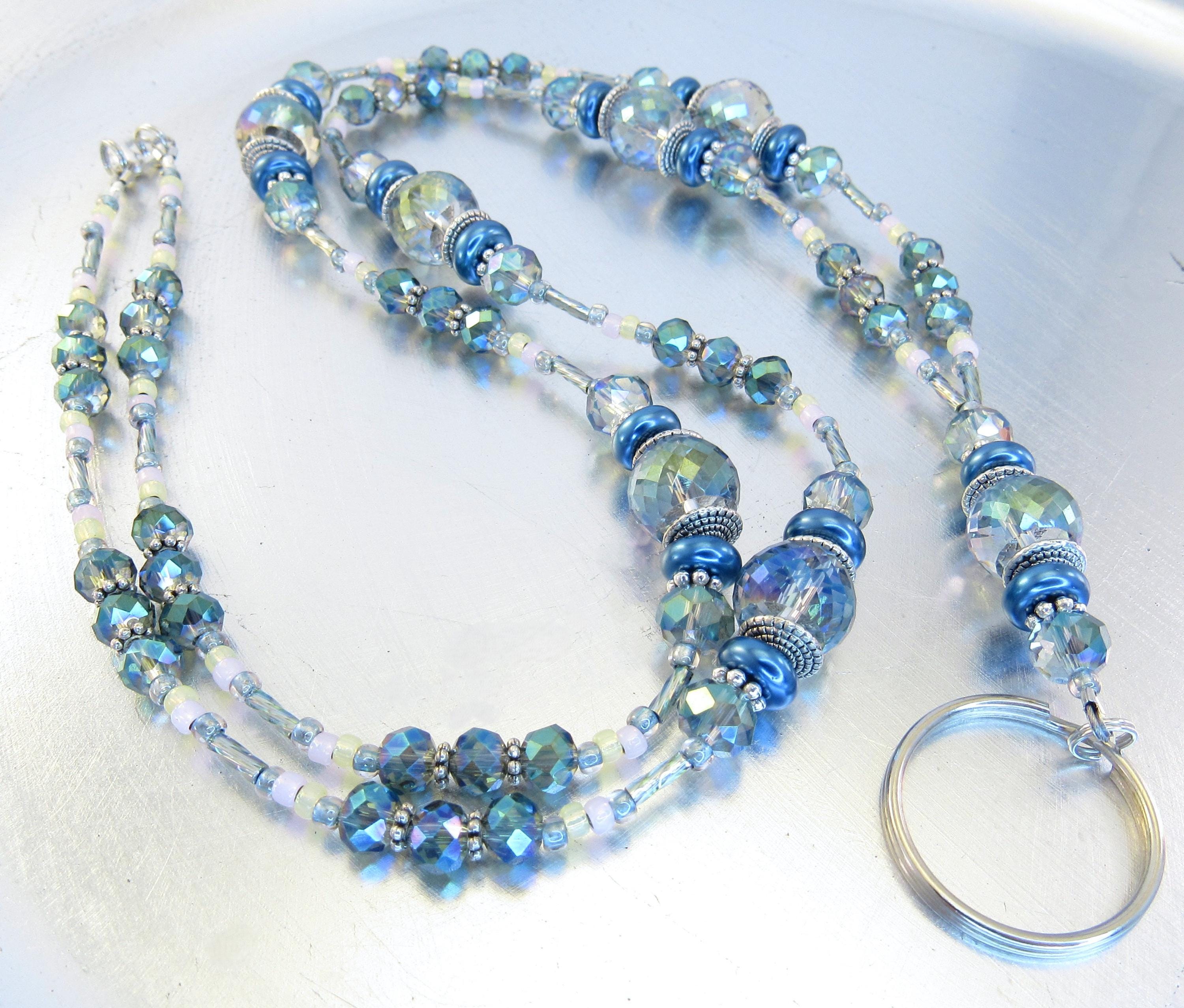 This is a stunning, sparkling ID lanyard that will compliment many outfits in your wardrobe. I made it with a mix of beautiful beads including faceted rotund 12mm aqua crystal glass beads, 8x4mm blue glass pearls, 8mm and 6mm faceted blue crystal glass beads, silver plated spacers, pastel pink and yellow and denim blue glass seed beads and gunmetal blue rainbow twisted glass bugle beads.