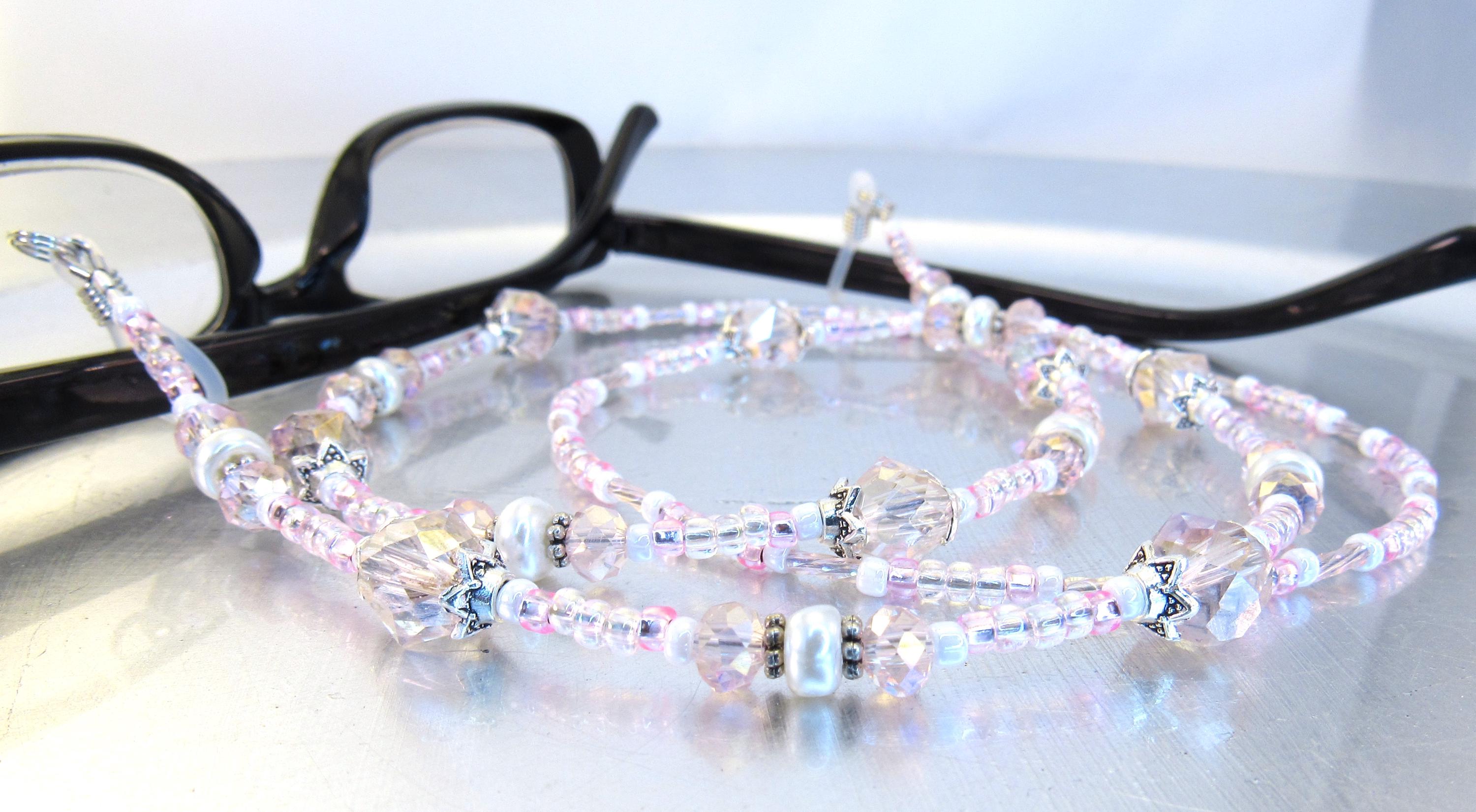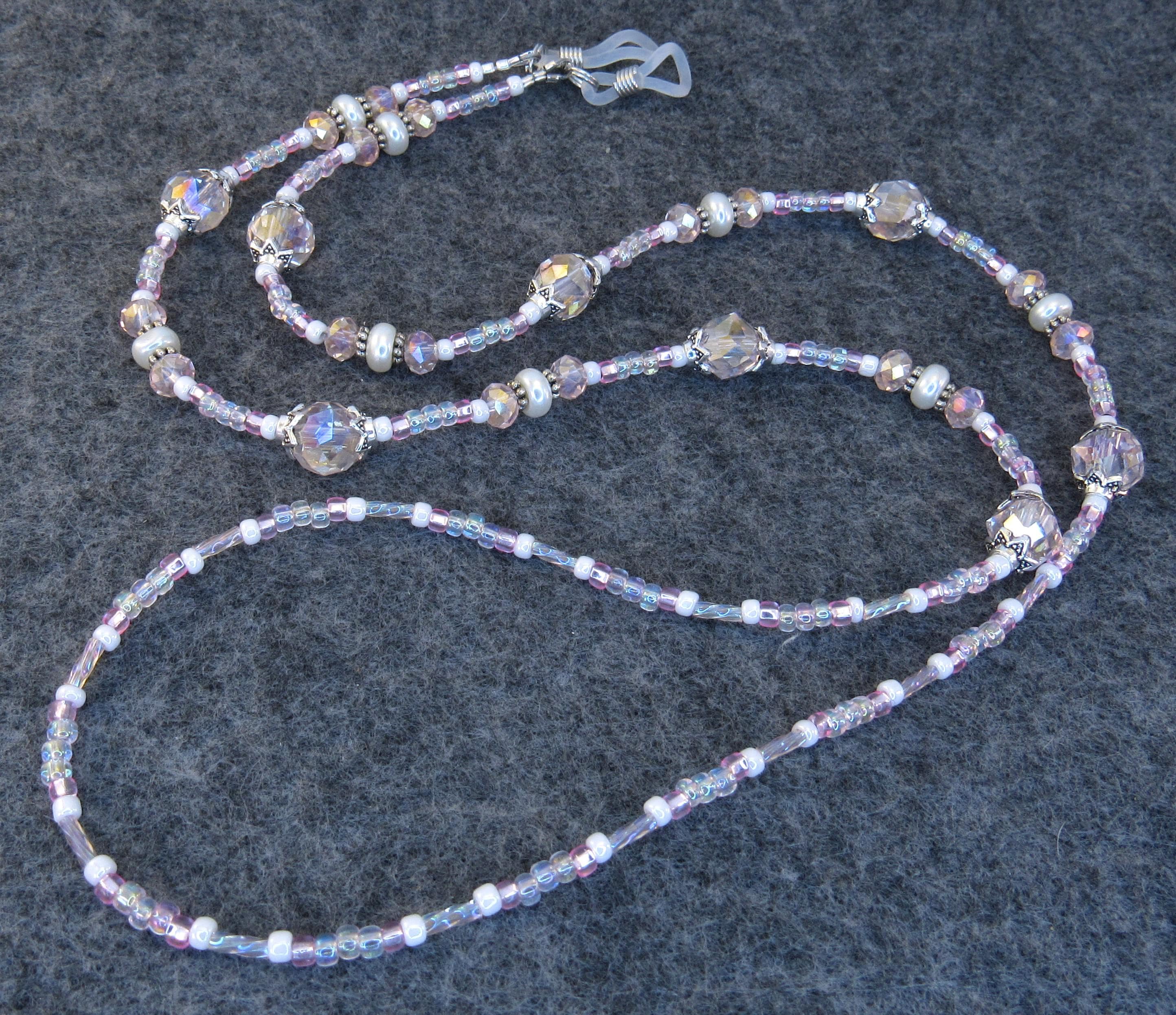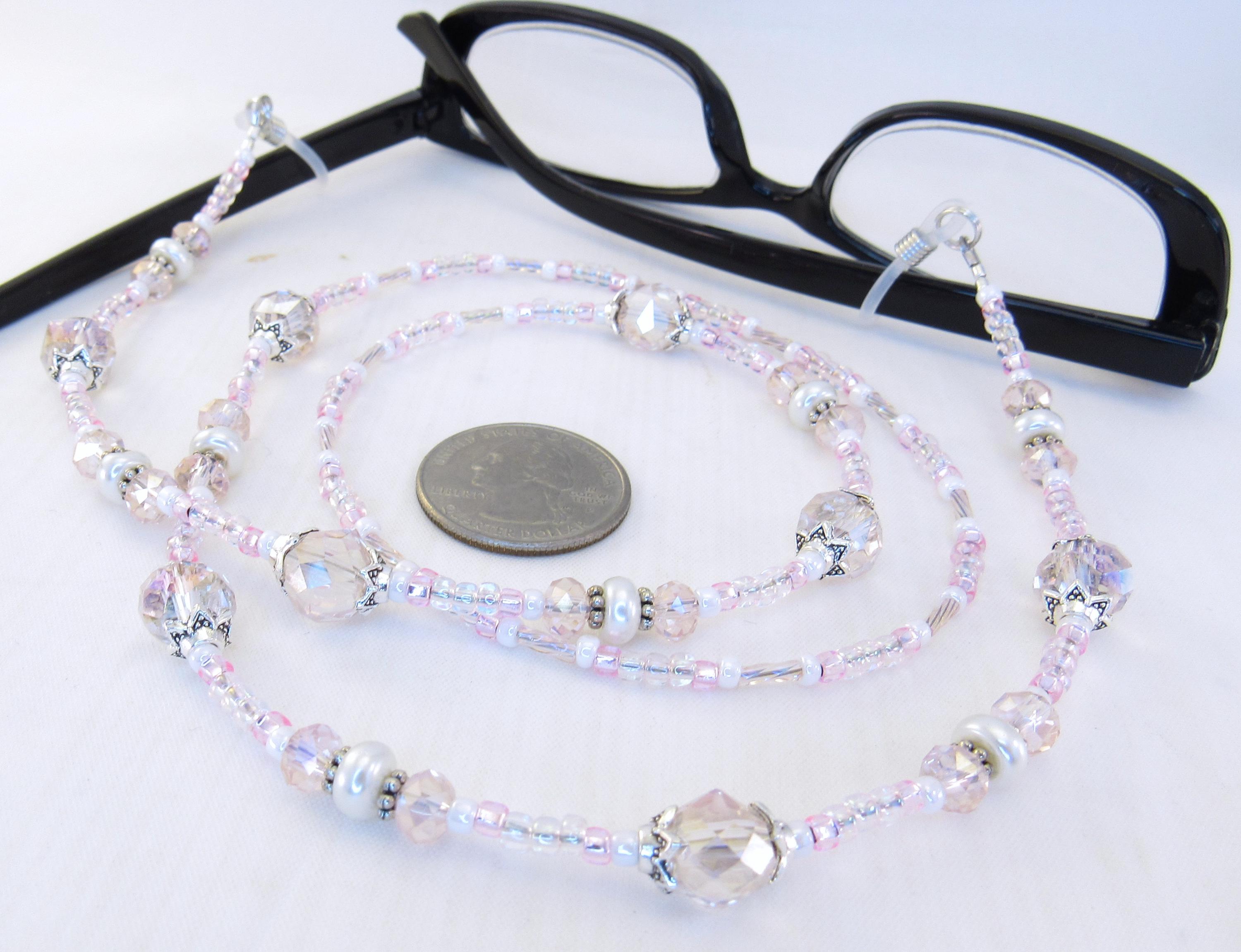 Stop losing your readers with this smart eyeglass lanyard. I made it with 8mm and 6mm pink faceted crystal glass beads, 2x7mm white glass pearls, silver plated spacers and findings, rainbow pink twisted bugle beads, with pink and white seed beads. Very light, easy to wear, bright and sparkly! Also makes a great gift!