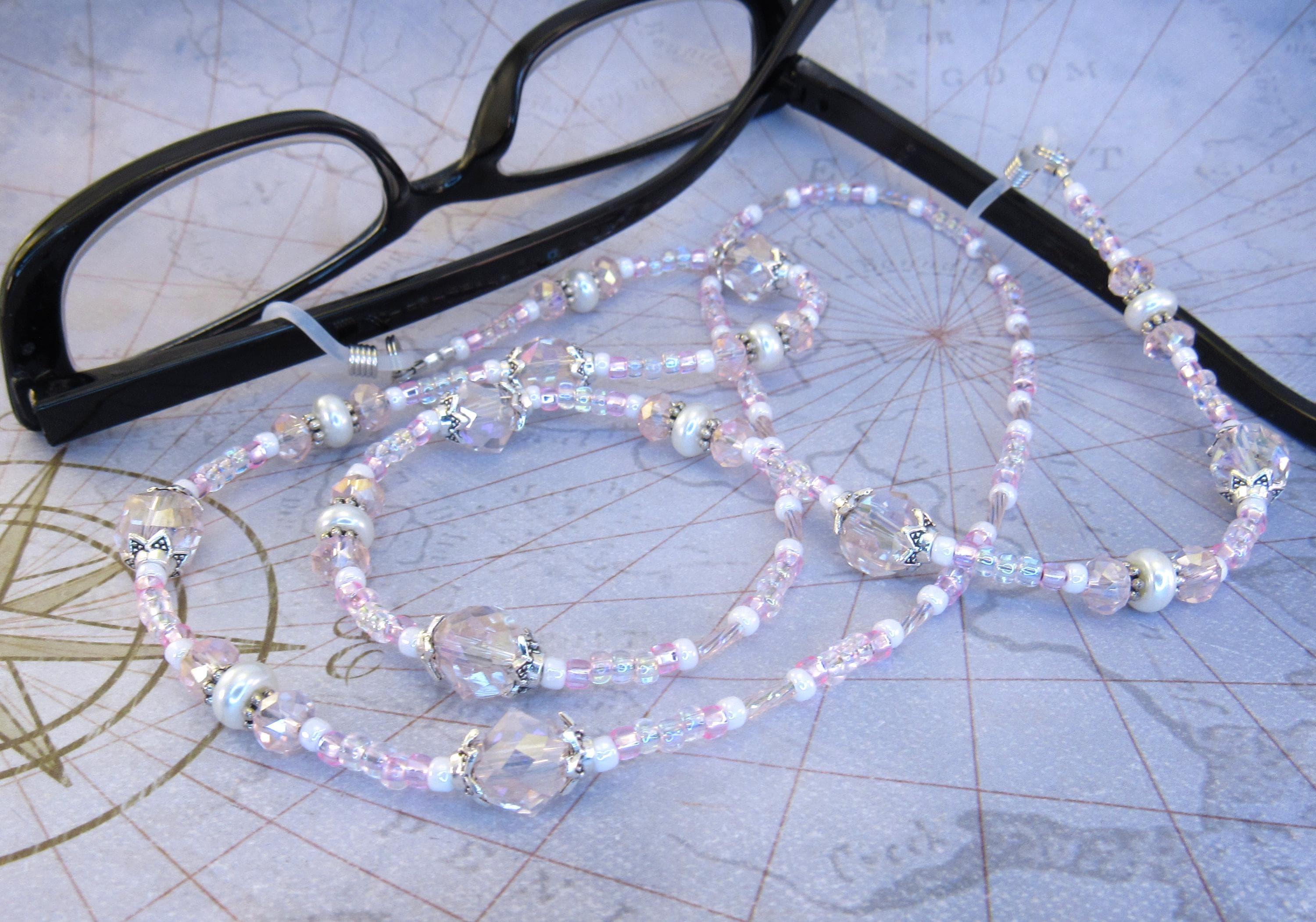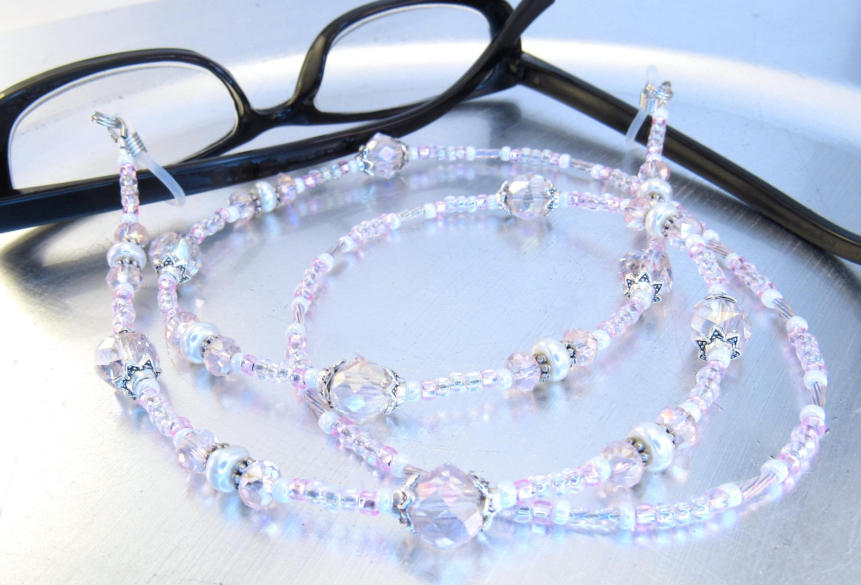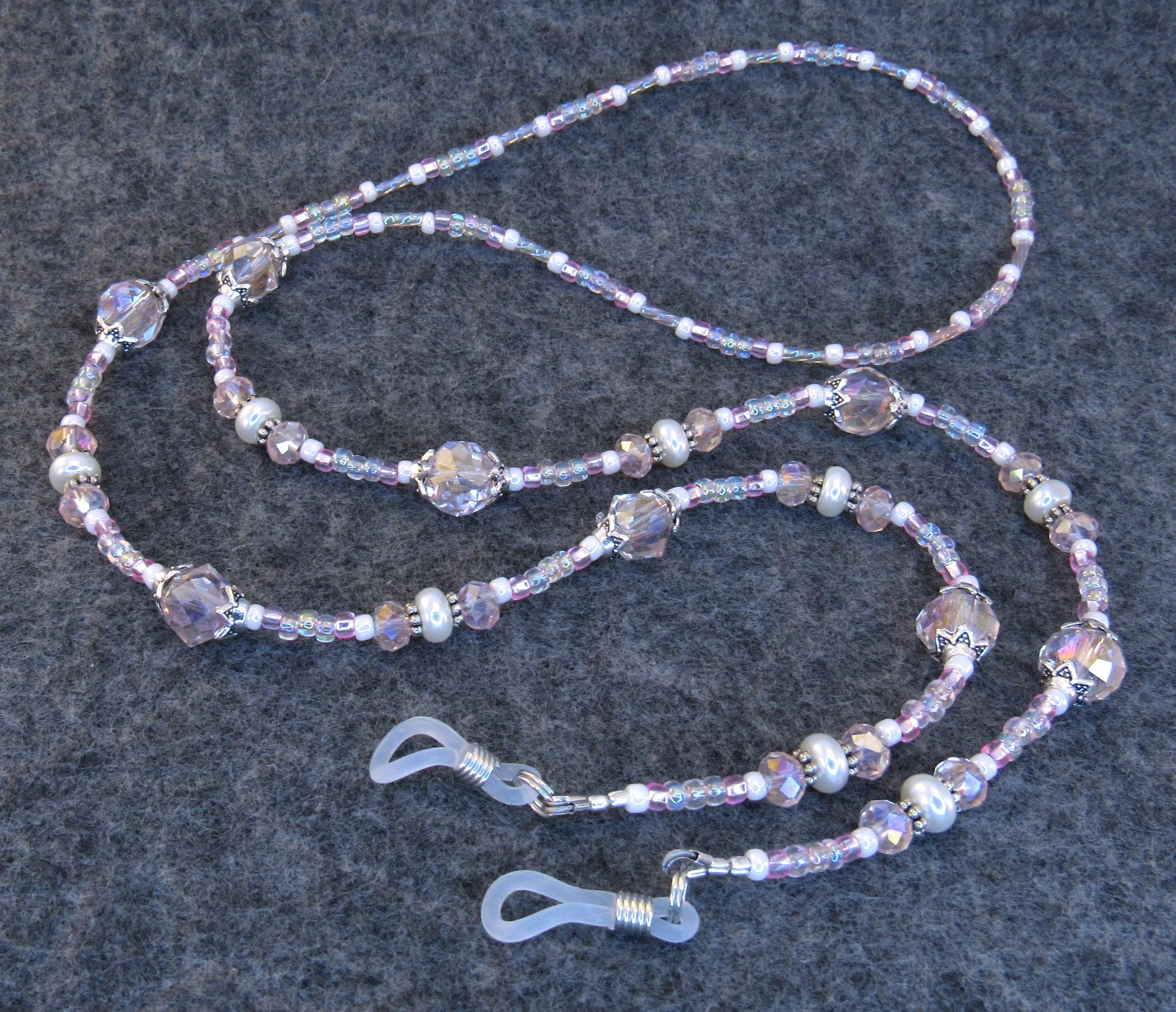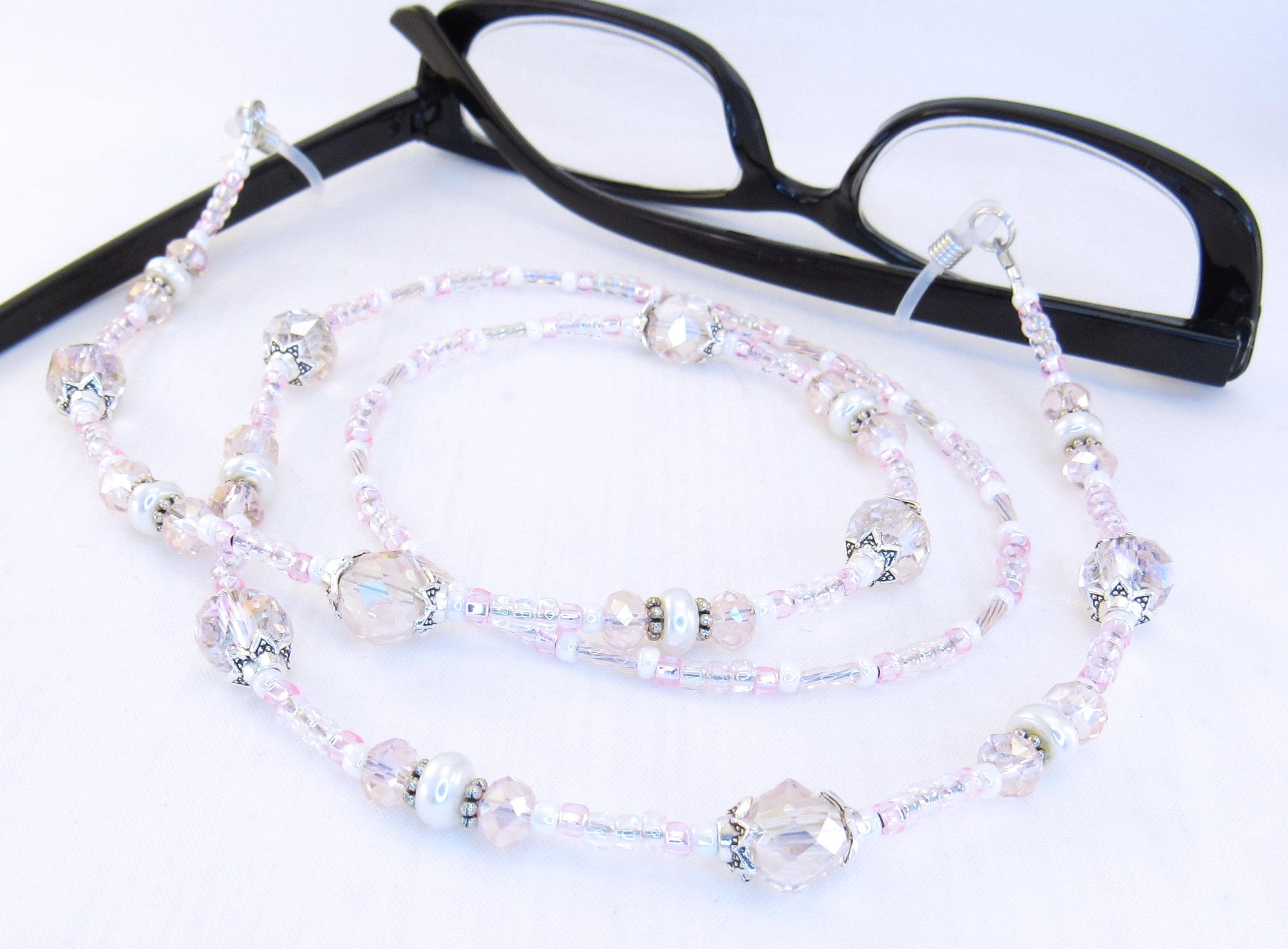 Stop losing your readers with this smart eyeglass lanyard. I made it with 8mm and 6mm pink faceted crystal glass beads, 2x7mm white glass pearls, silver plated spacers and findings, rainbow pink twisted bugle beads, with pink and white seed beads. Very light, easy to wear, bright and sparkly! Also makes a great gift!