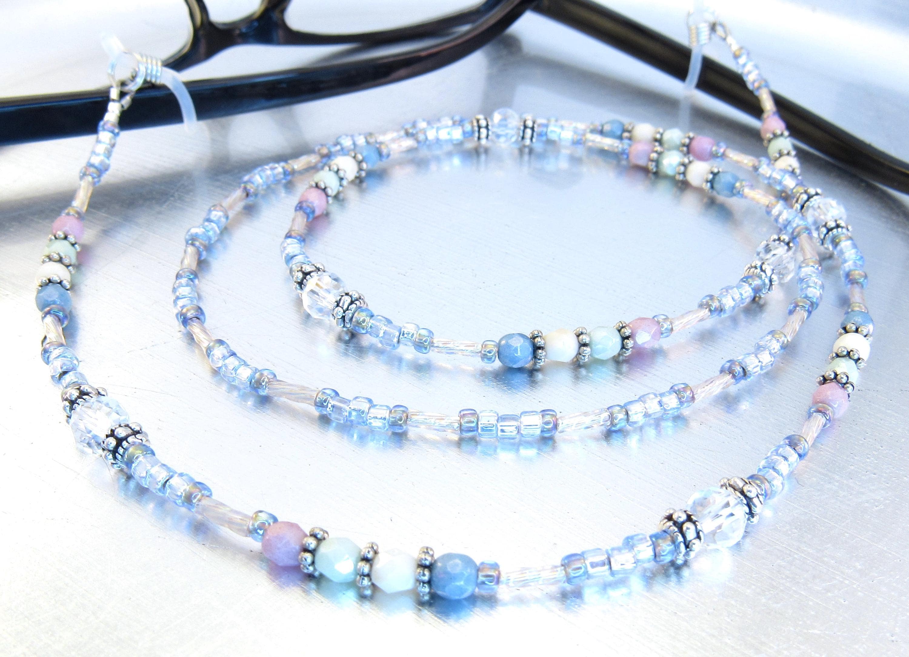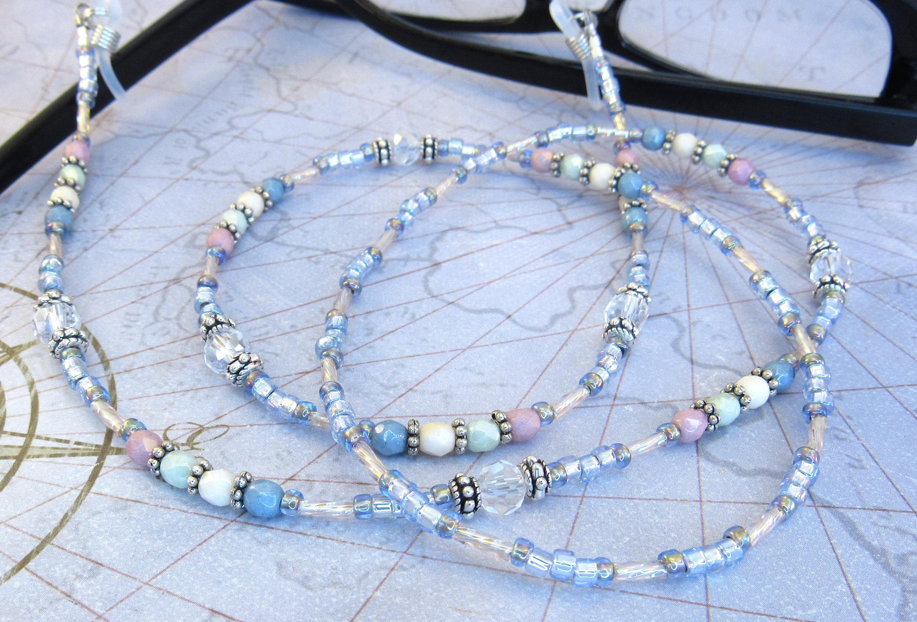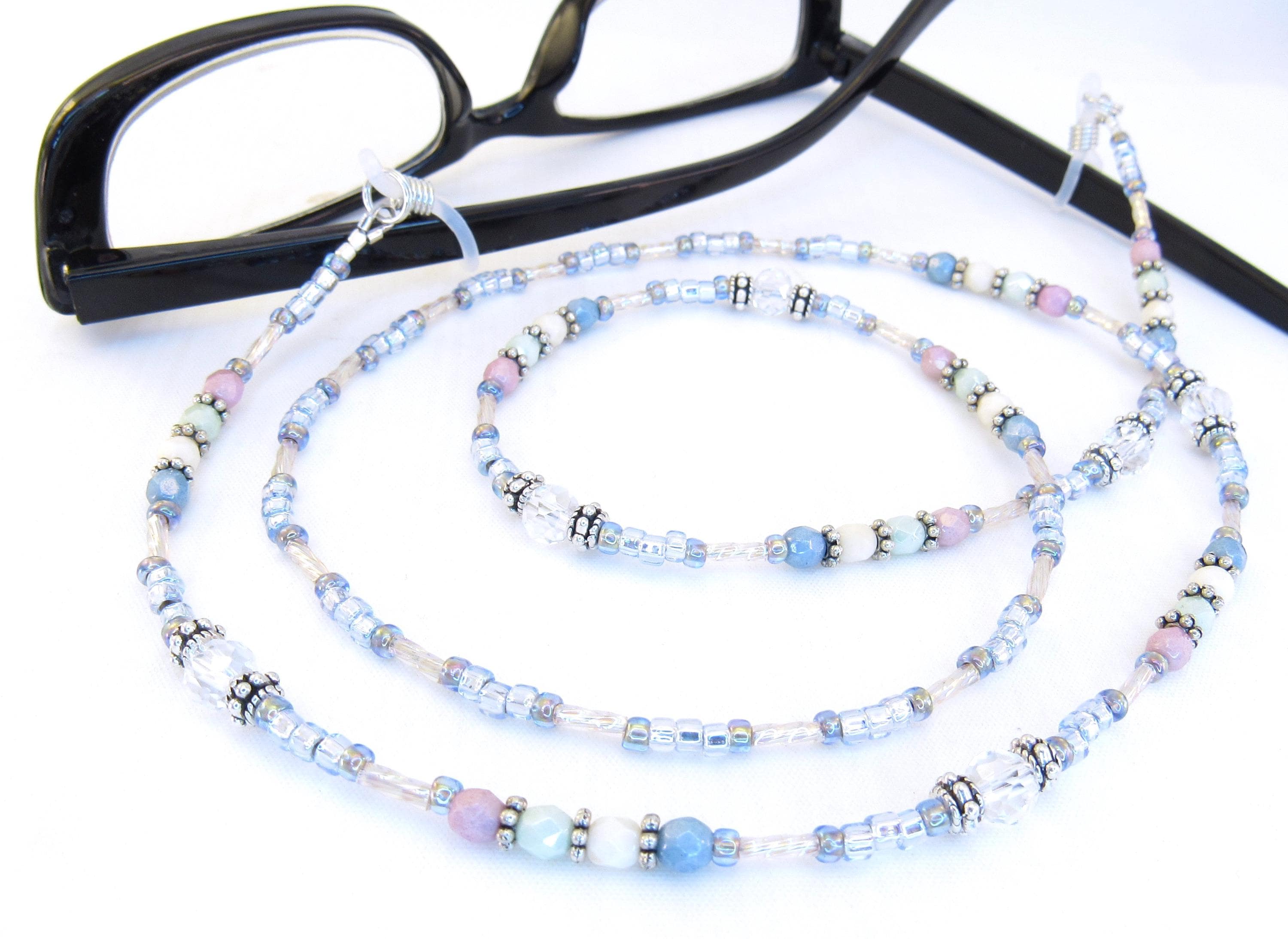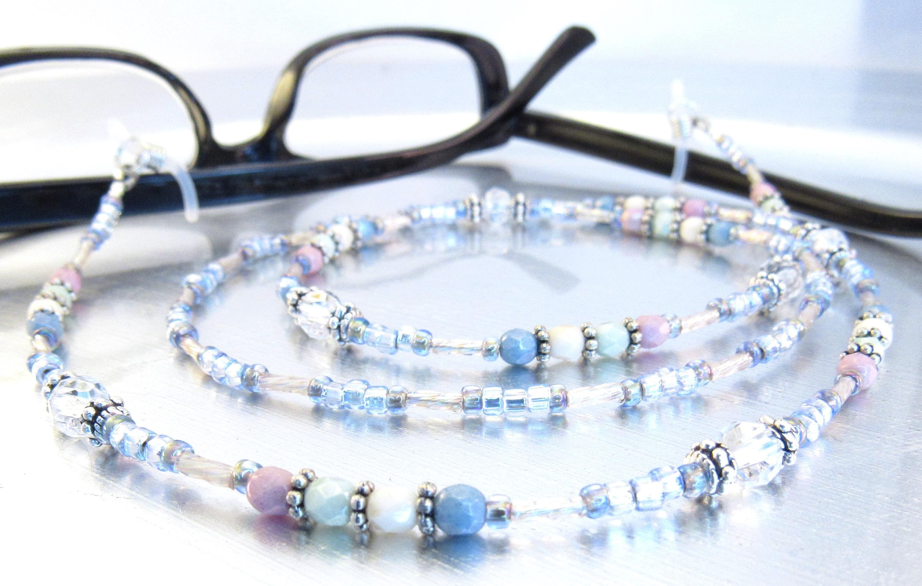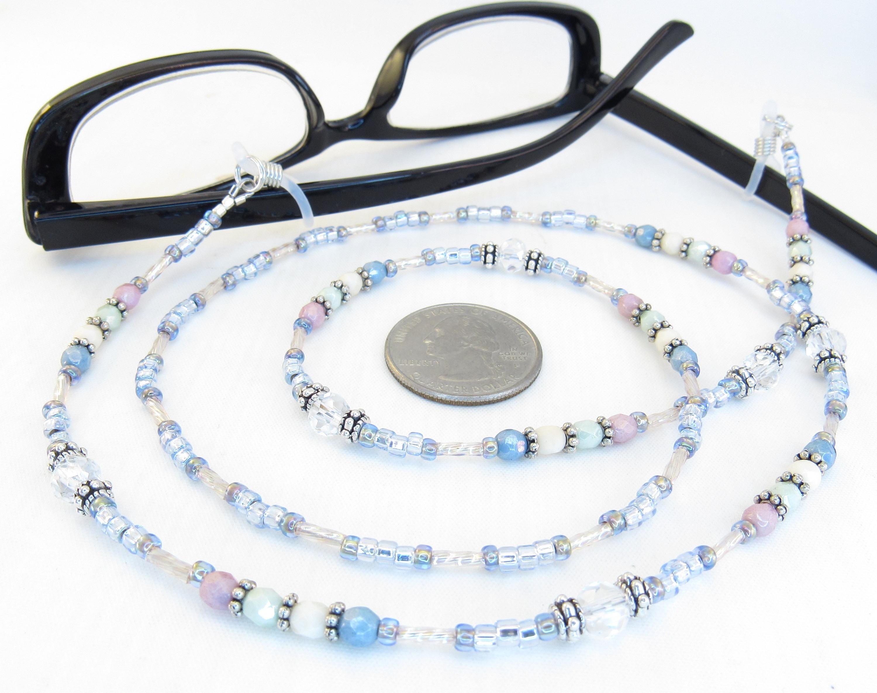 Stop losing your readers with this smart eyeglass lanyard. I made it with 6mm pastel blue, cream, light green and pink faceted glass beads, 6mm faceted clear crystal glass beads, silver plated spacers and findings, rainbow pink twisted bugle beads, with light sapphire clear lined mink rainbow and ice blue AB seed beads. Very light, easy to wear, also makes a great gift!
