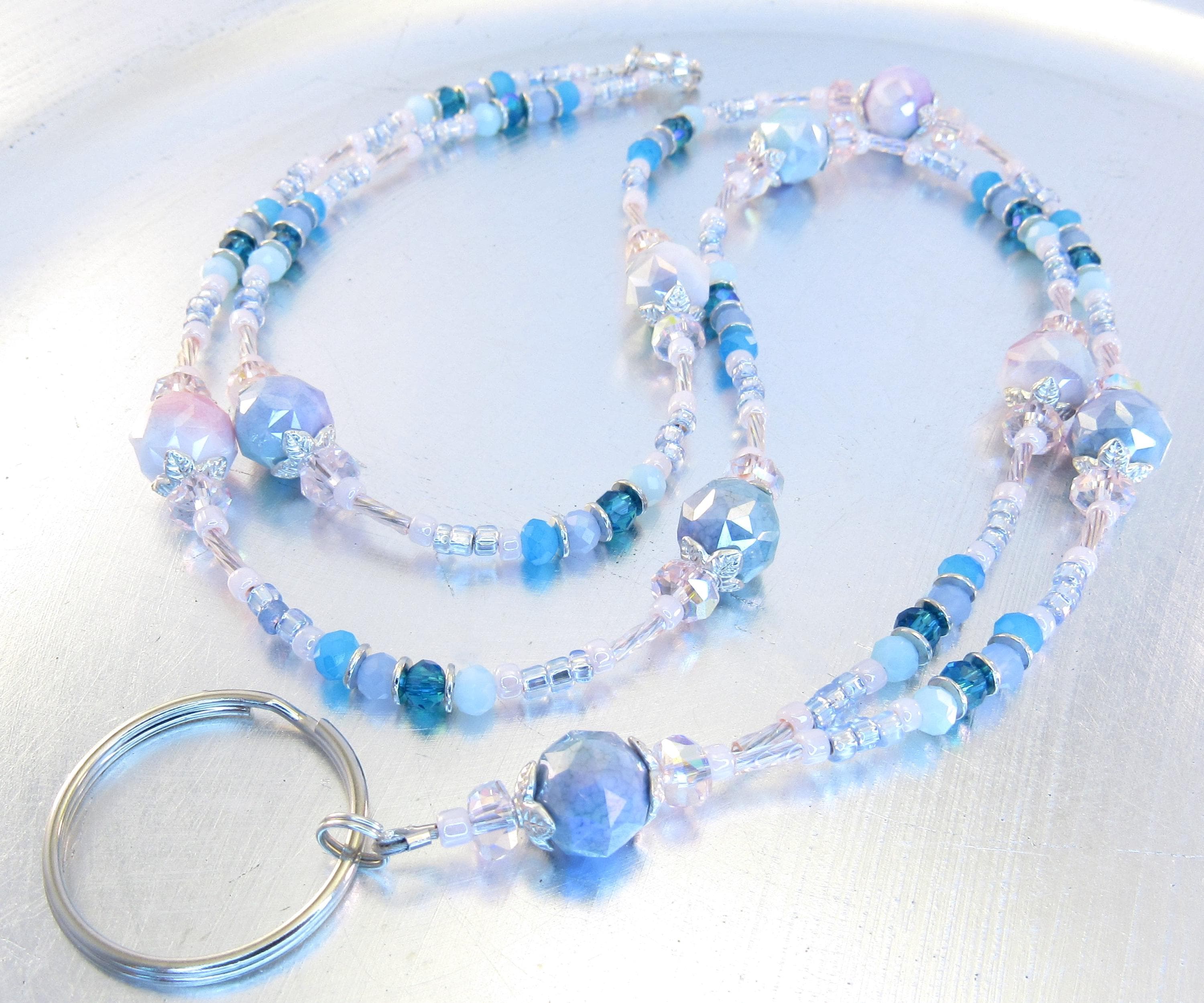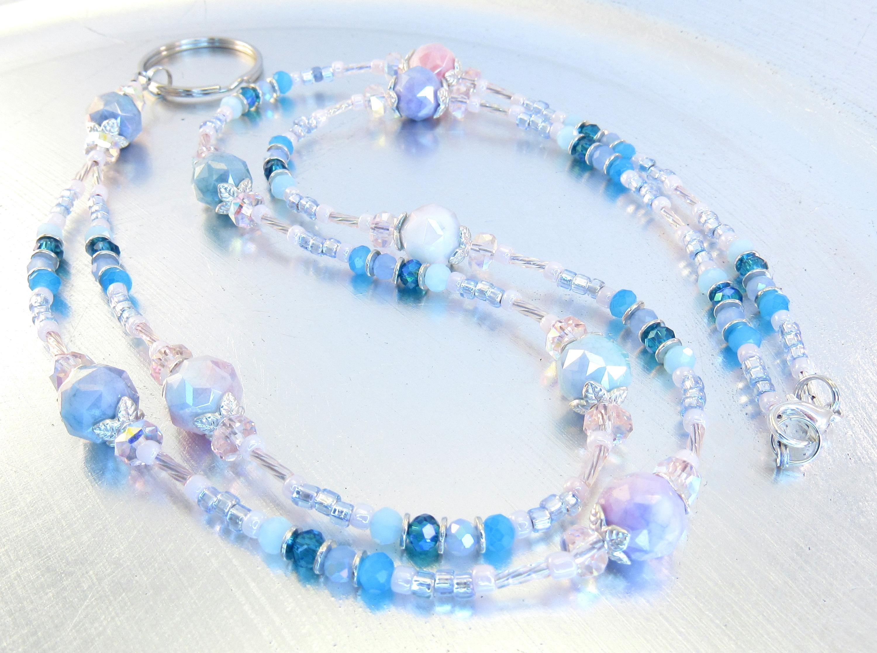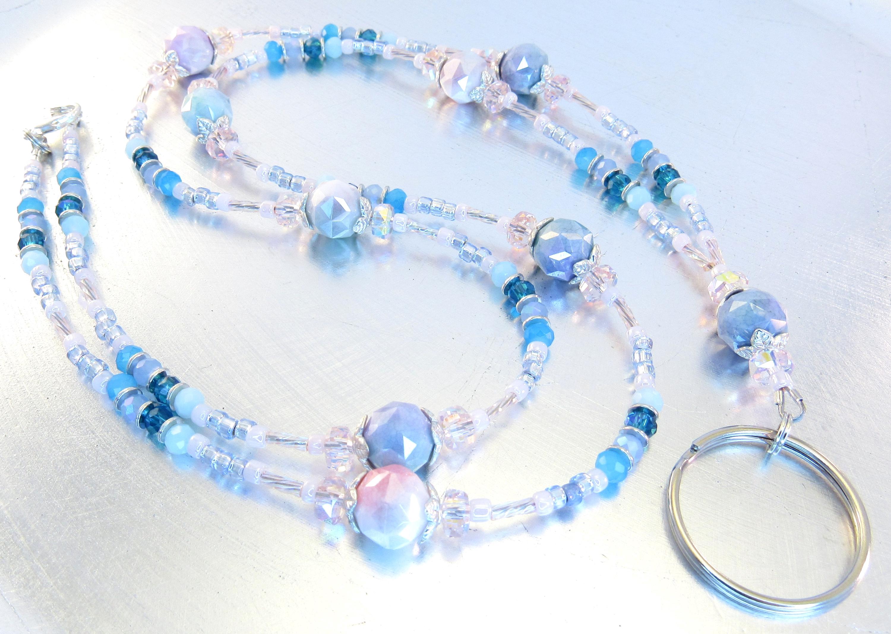 I made this cute pastel lanyard with 10mm rainbow plated faceted glass beads, 4x6mm pink crystal faceted rondelle glass, 4mm shades of blue faceted glass, pastel pink and blue ice glass seed beads, pink rainbow twisted bugle beads, and silver-plated spacers and findings.