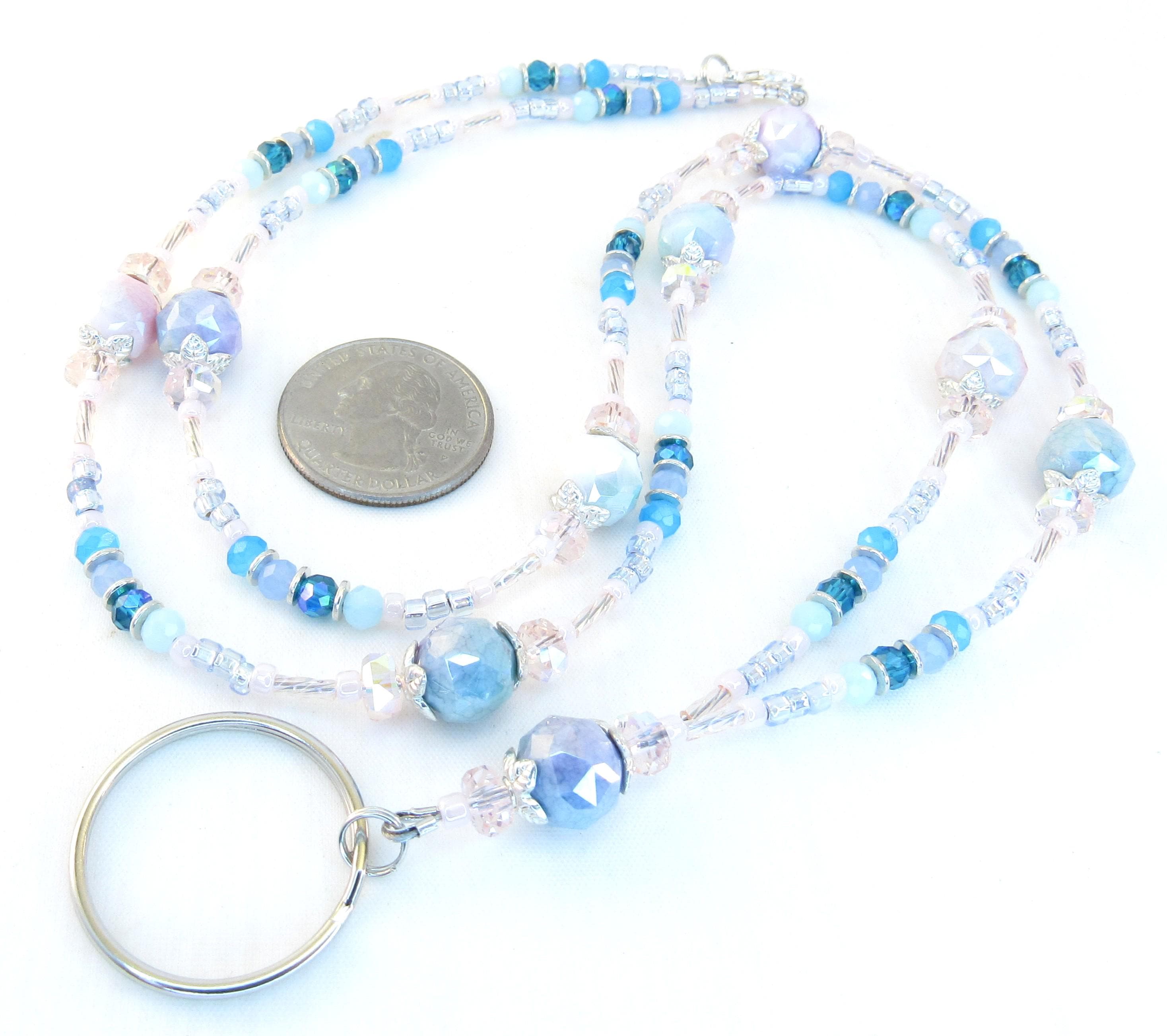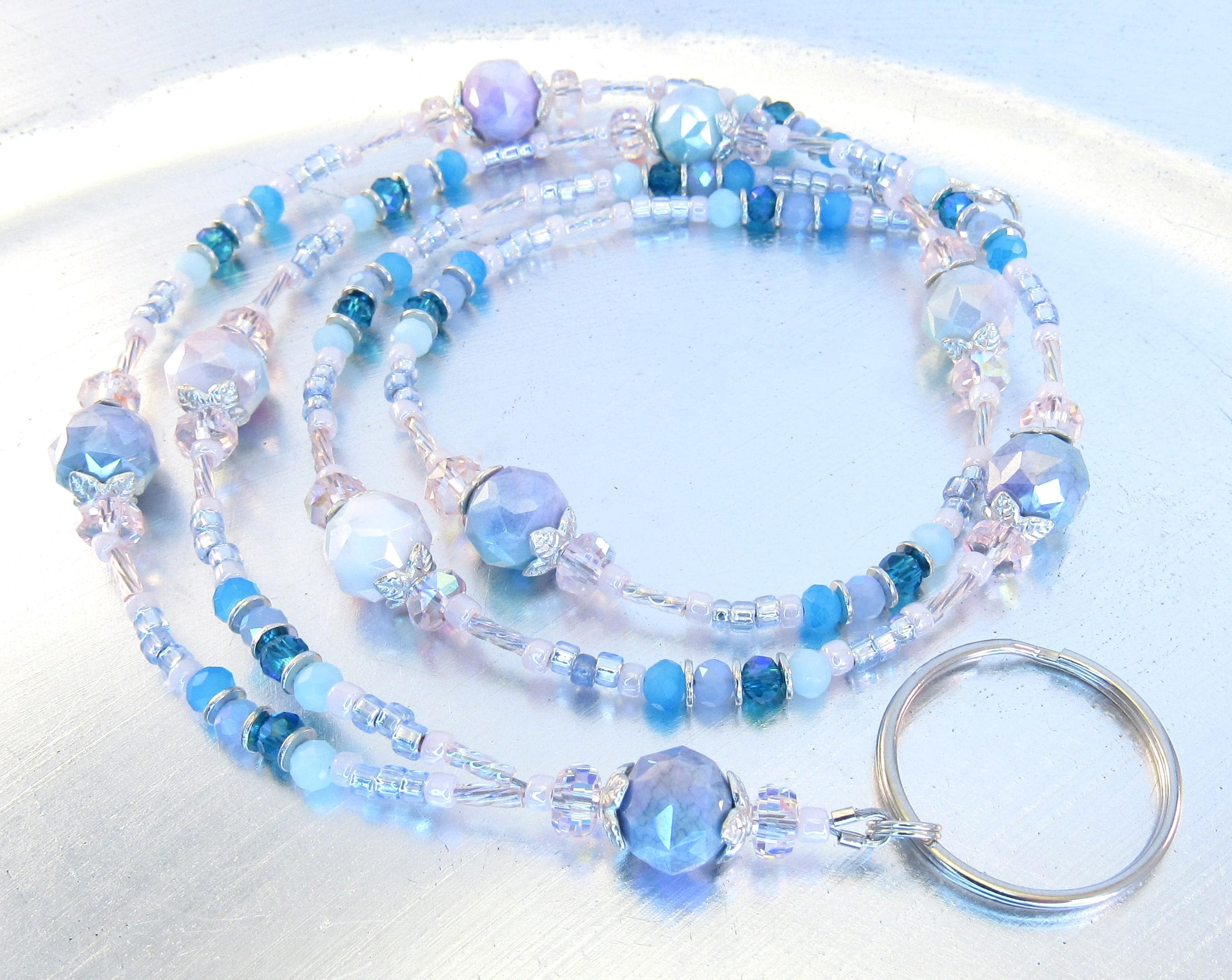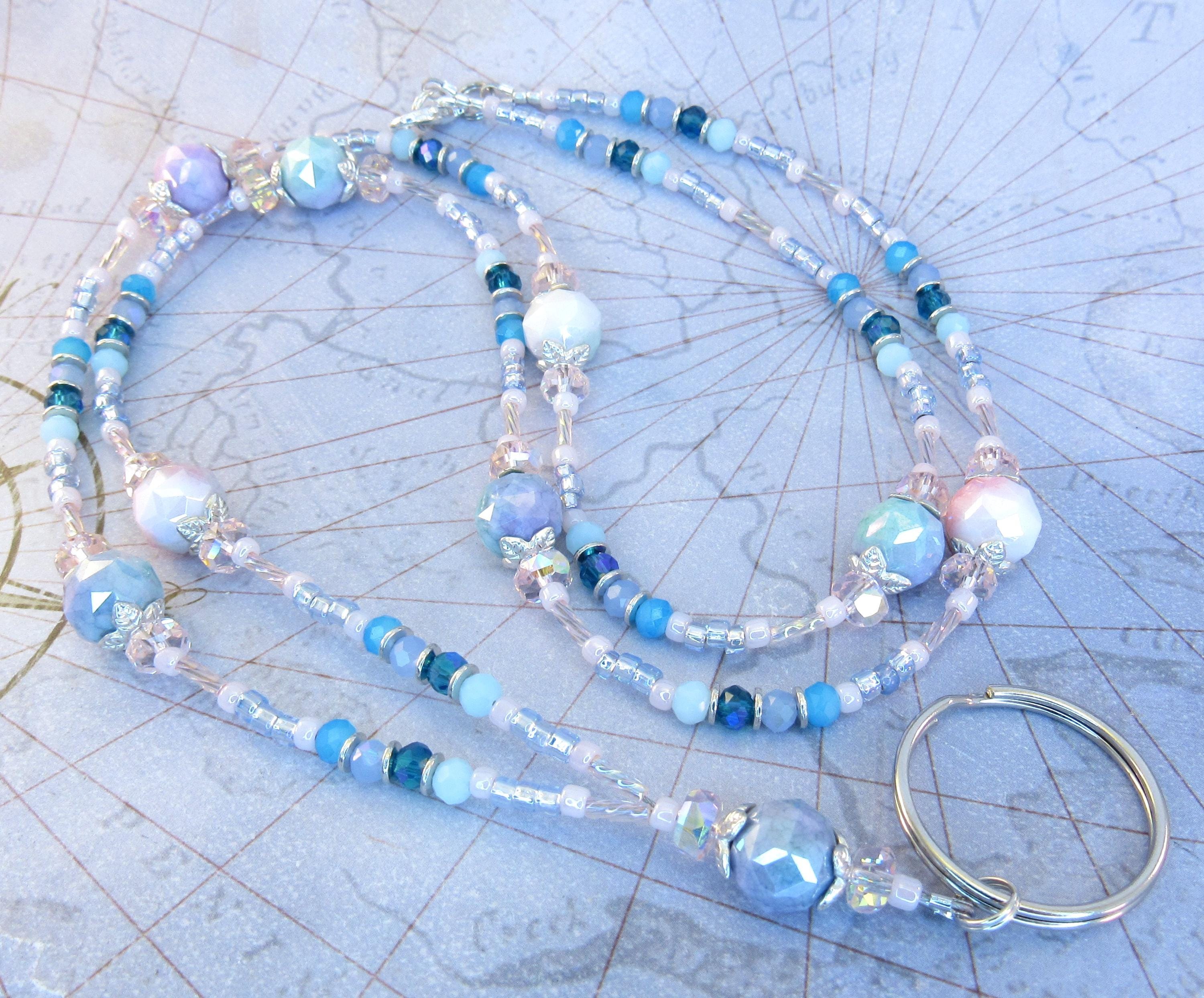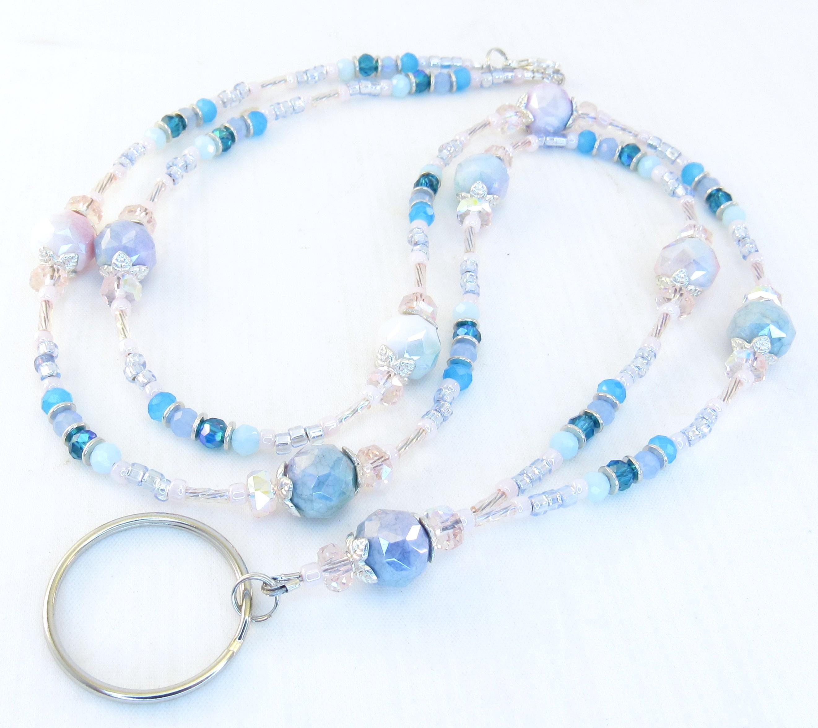 I made this cute pastel lanyard with 10mm rainbow plated faceted glass beads, 4x6mm pink crystal faceted rondelle glass, 4mm shades of blue faceted glass, pastel pink and blue ice glass seed beads, pink rainbow twisted bugle beads, and silver-plated spacers and findings.