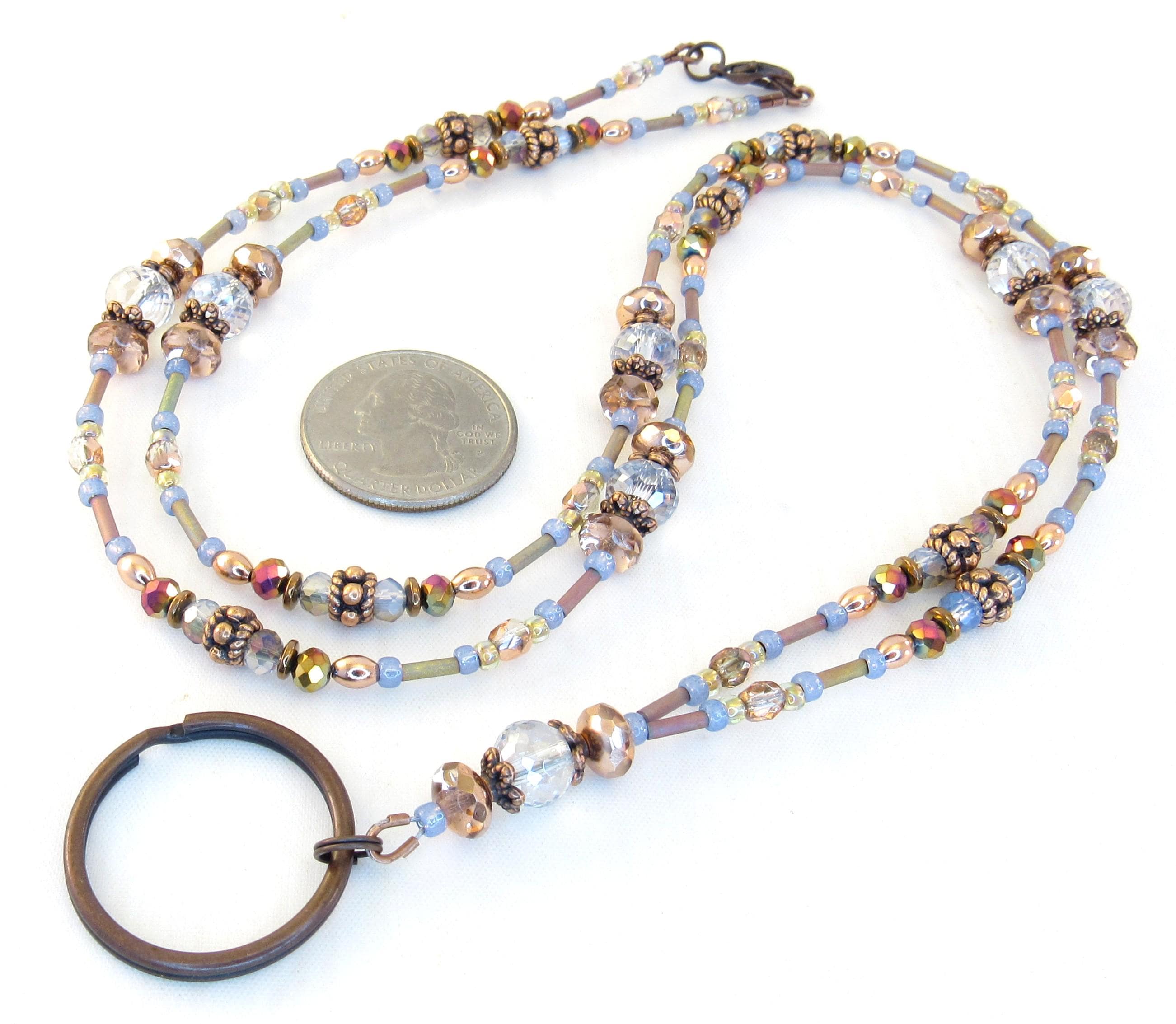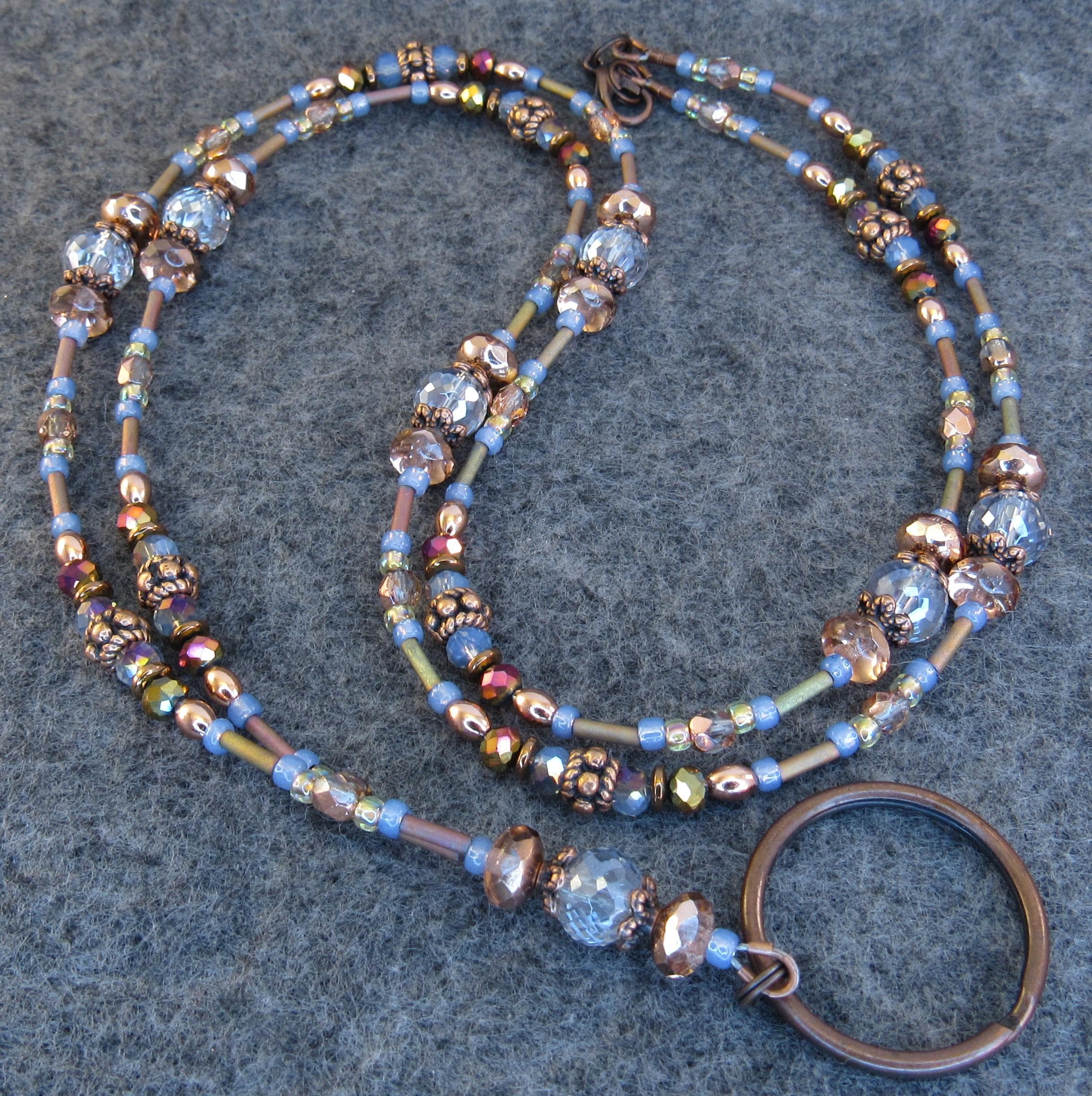 Light Blue, Copper, and Metallic Capri Gold Sparkly Crystal Glass Badge Holder, ID Lanyard, Glasses Holder