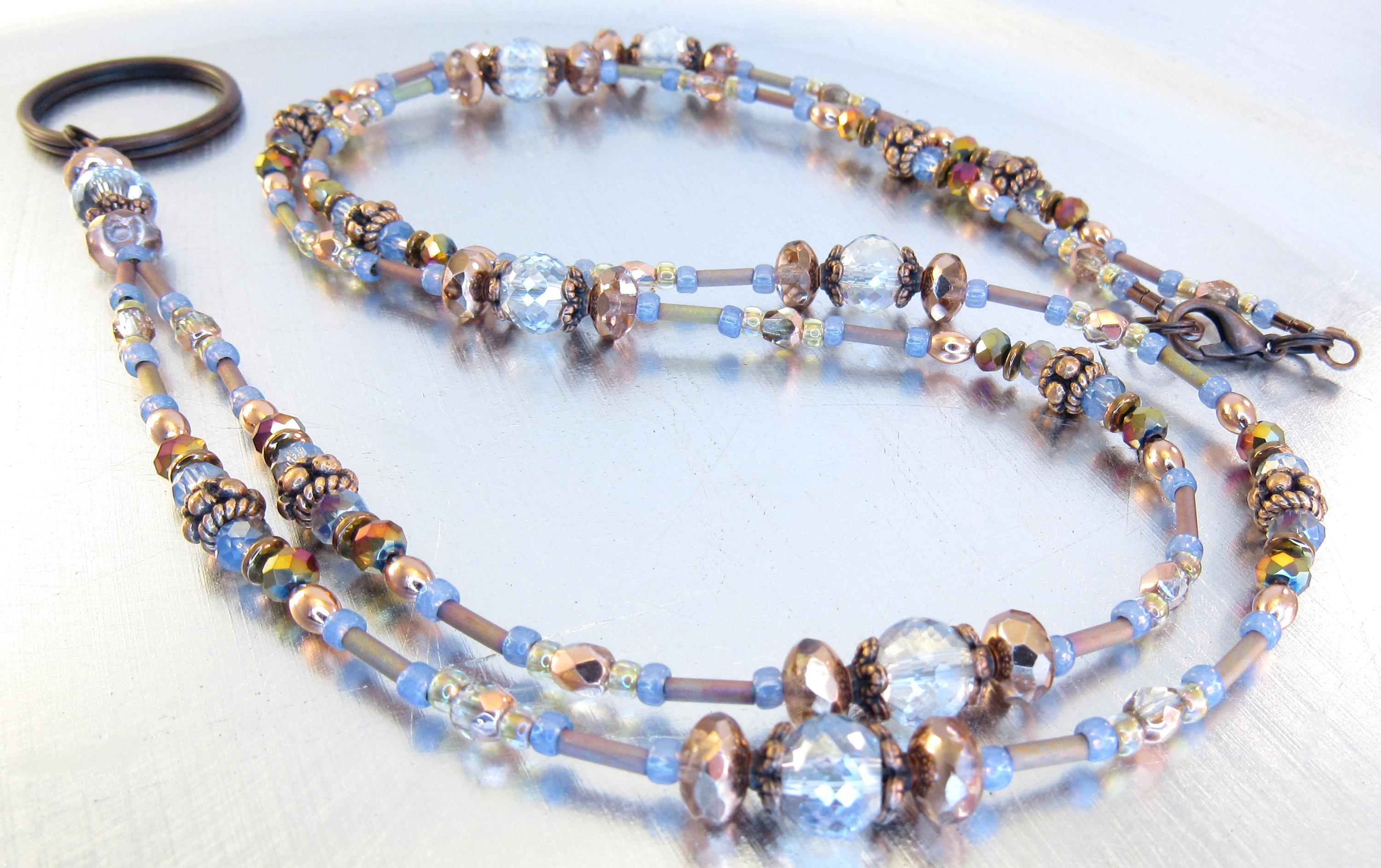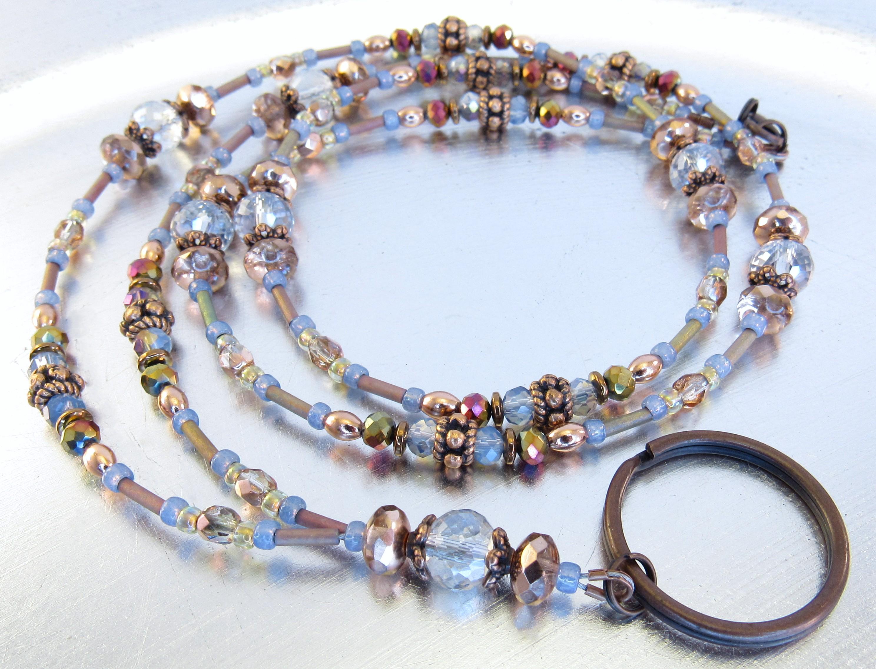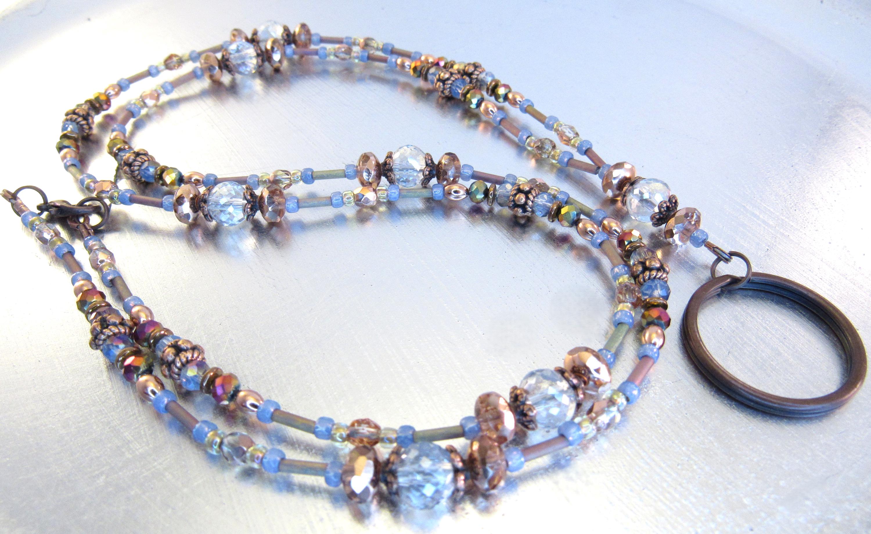 Give as a gift or keep for yourself! This ID lanyard is beautifully elegant and unique! Made with 6x8mm faceted light blue crystal glass beads, 7x5mm apricot fire polished crystal glass beads, 4mm metallic rainbow faceted glass beads, 4mm capri gold crystal glass beads, 4mm light blue metallic faceted crystal glass, Montana blue opal glass seed beads, mint clear lined mink rainbow seed beads, metallic mauve-green metal iris matte bugle beads, and copper plated spacers and findings.