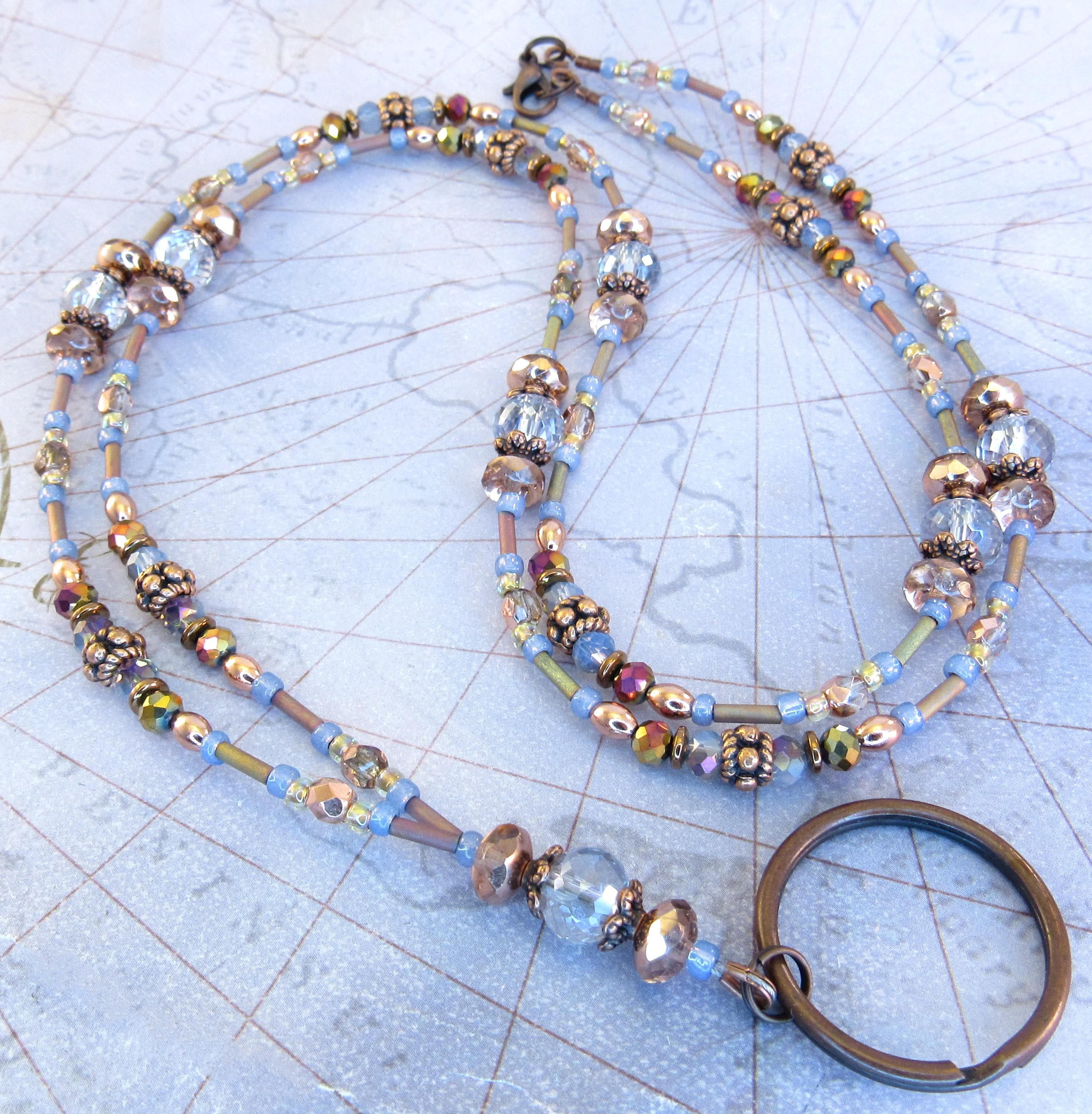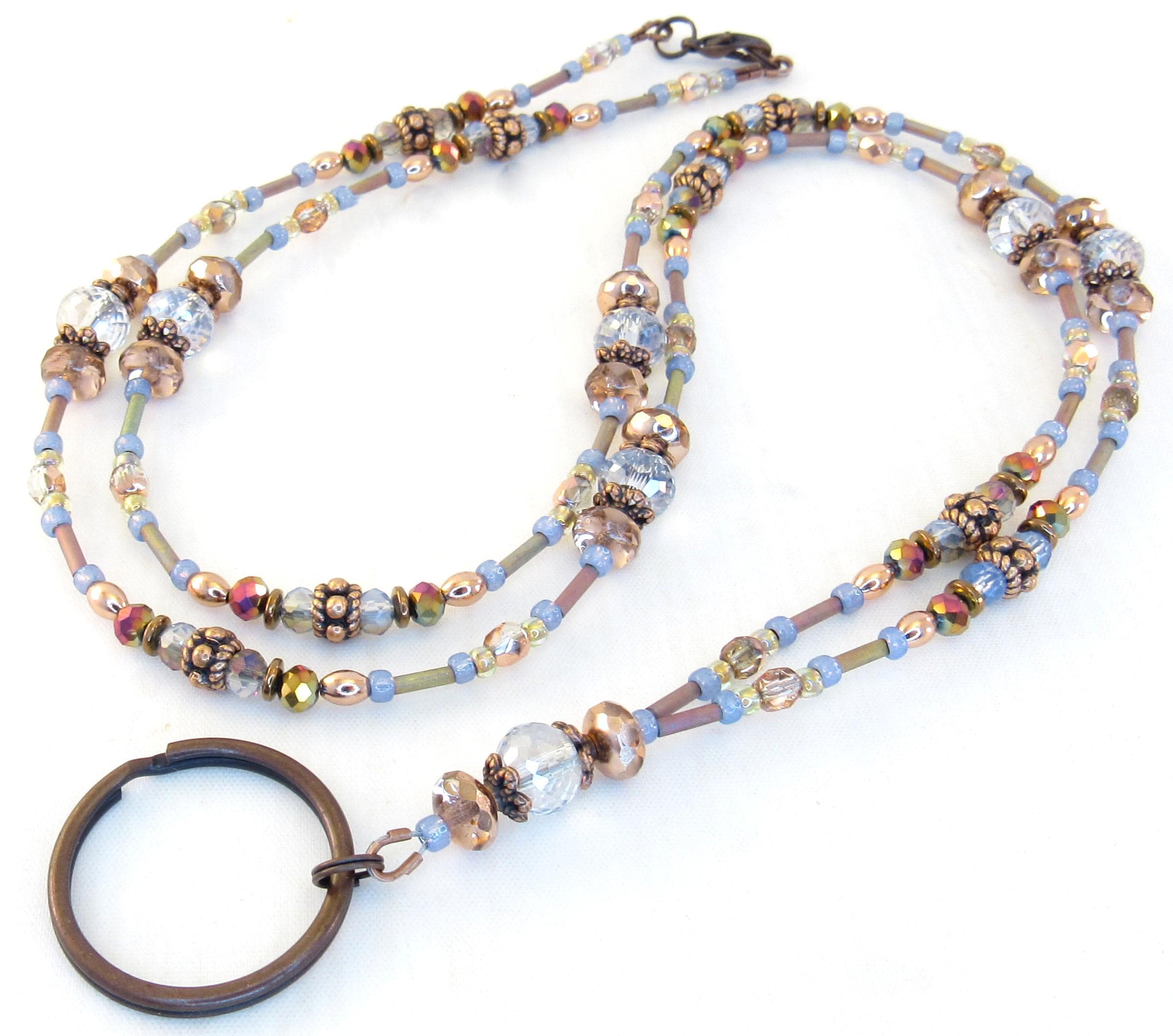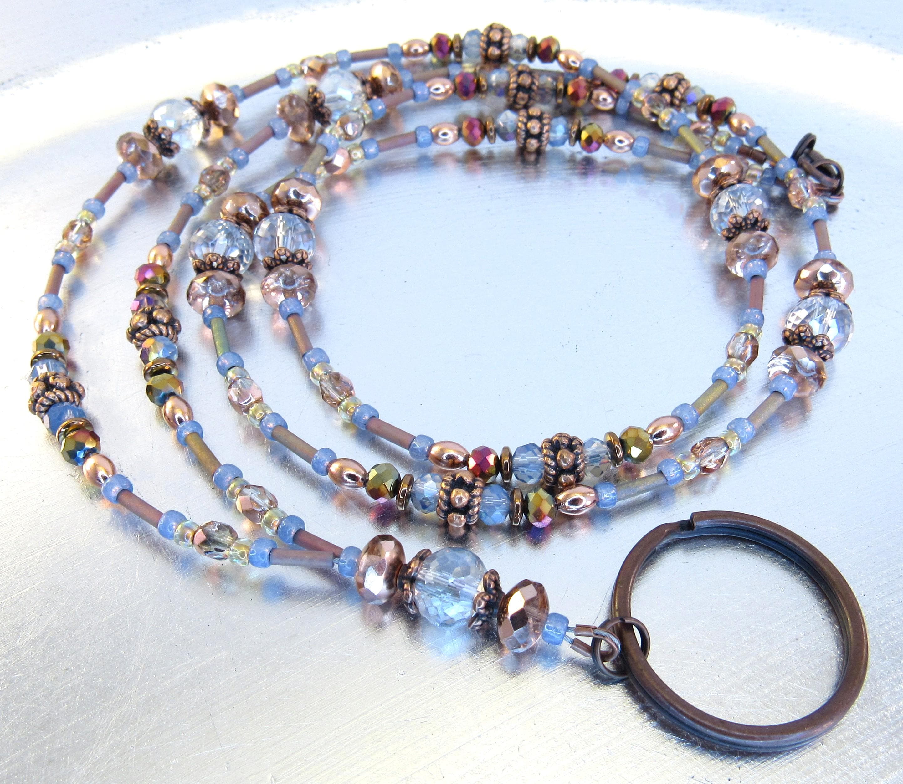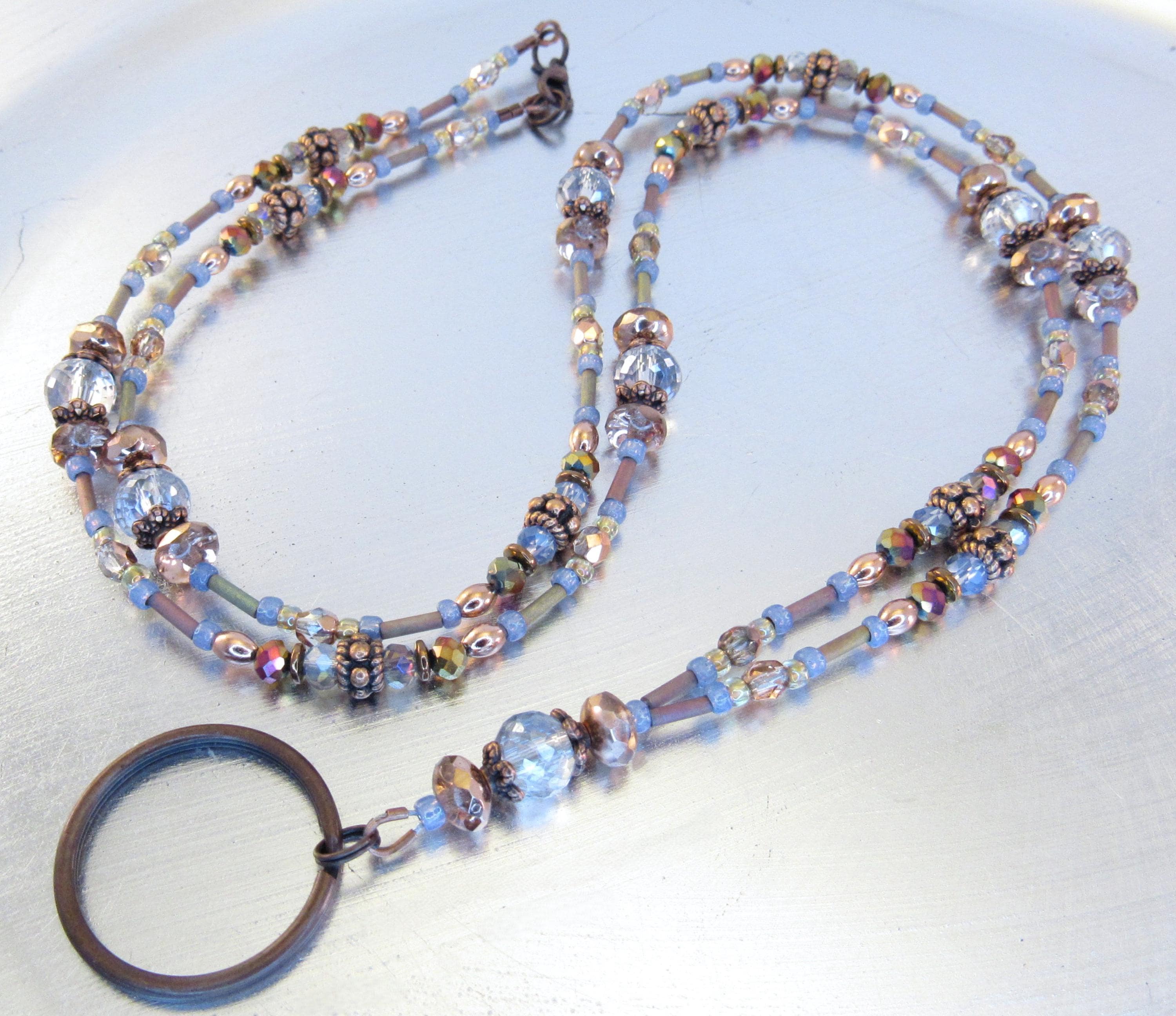 Give as a gift or keep for yourself! This ID lanyard is beautifully elegant and unique! Made with 6x8mm faceted light blue crystal glass beads, 7x5mm apricot fire polished crystal glass beads, 4mm metallic rainbow faceted glass beads, 4mm capri gold crystal glass beads, 4mm light blue metallic faceted crystal glass, Montana blue opal glass seed beads, mint clear lined mink rainbow seed beads, metallic mauve-green metal iris matte bugle beads, and copper plated spacers and findings.