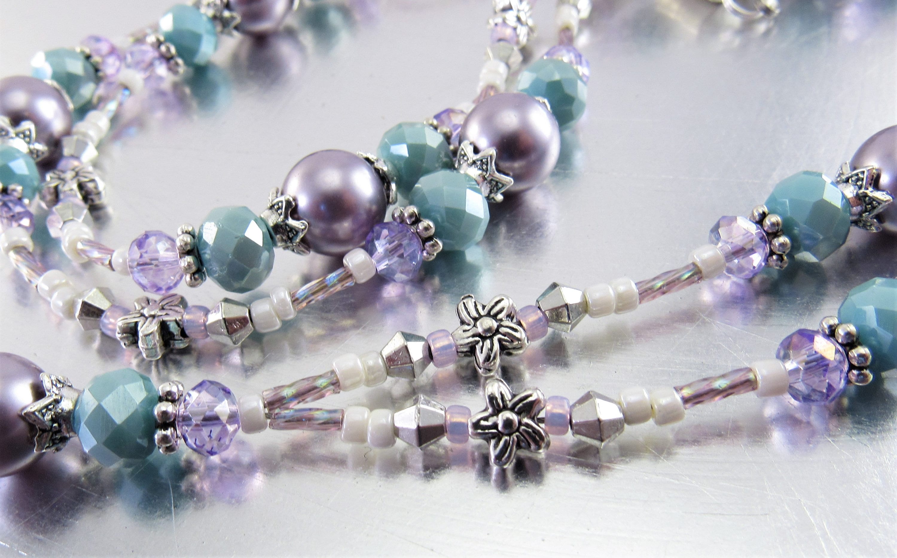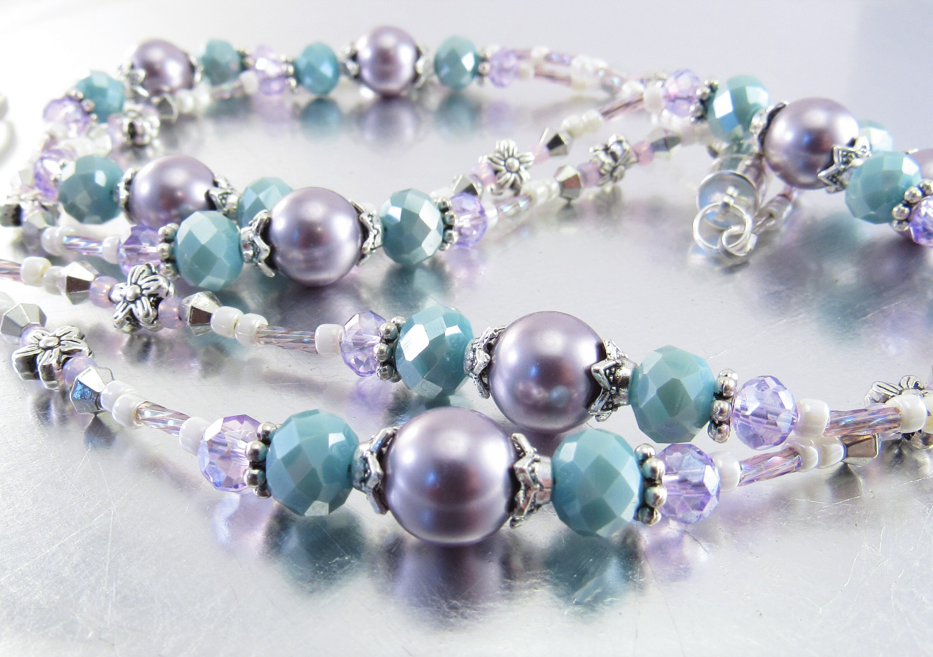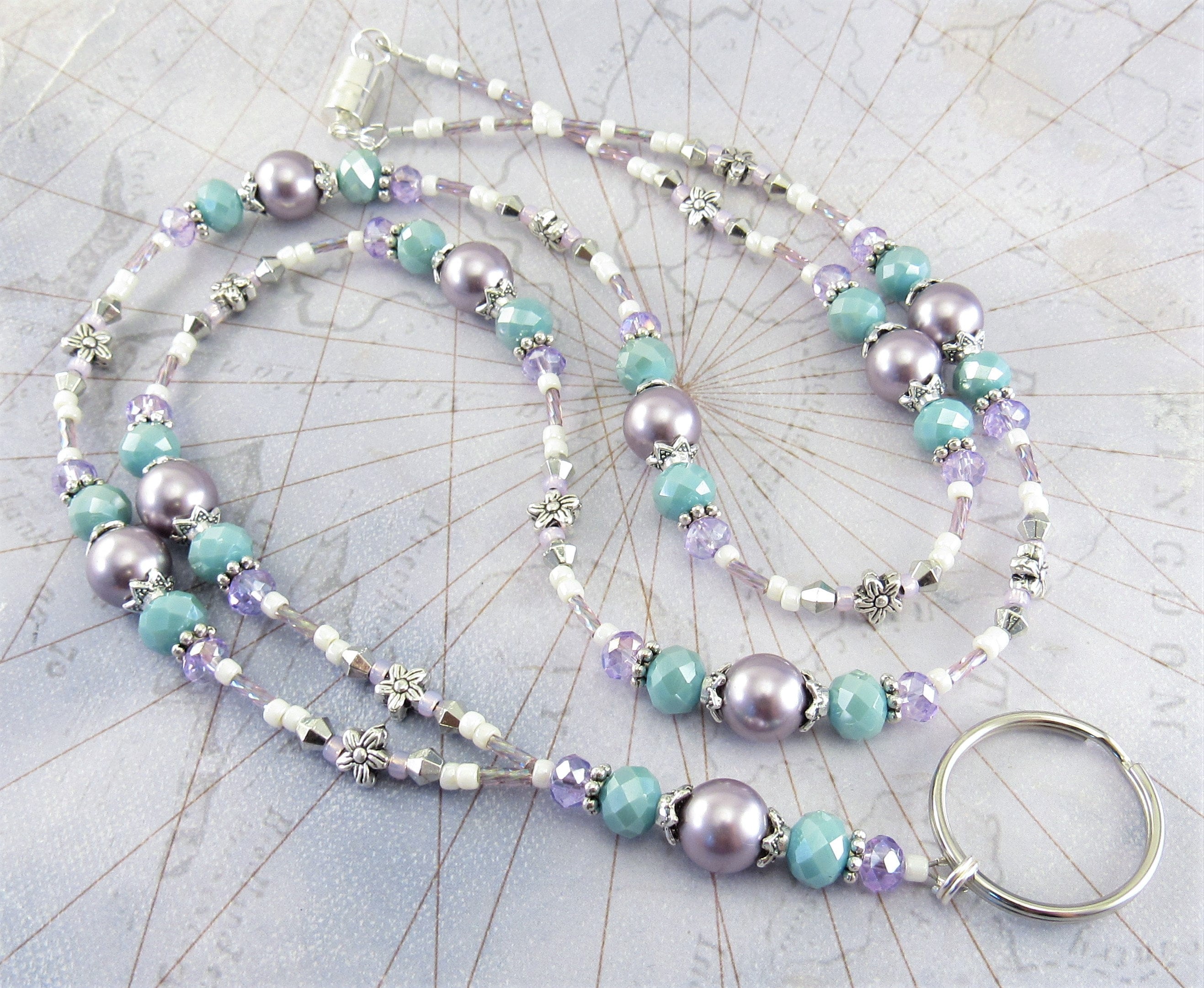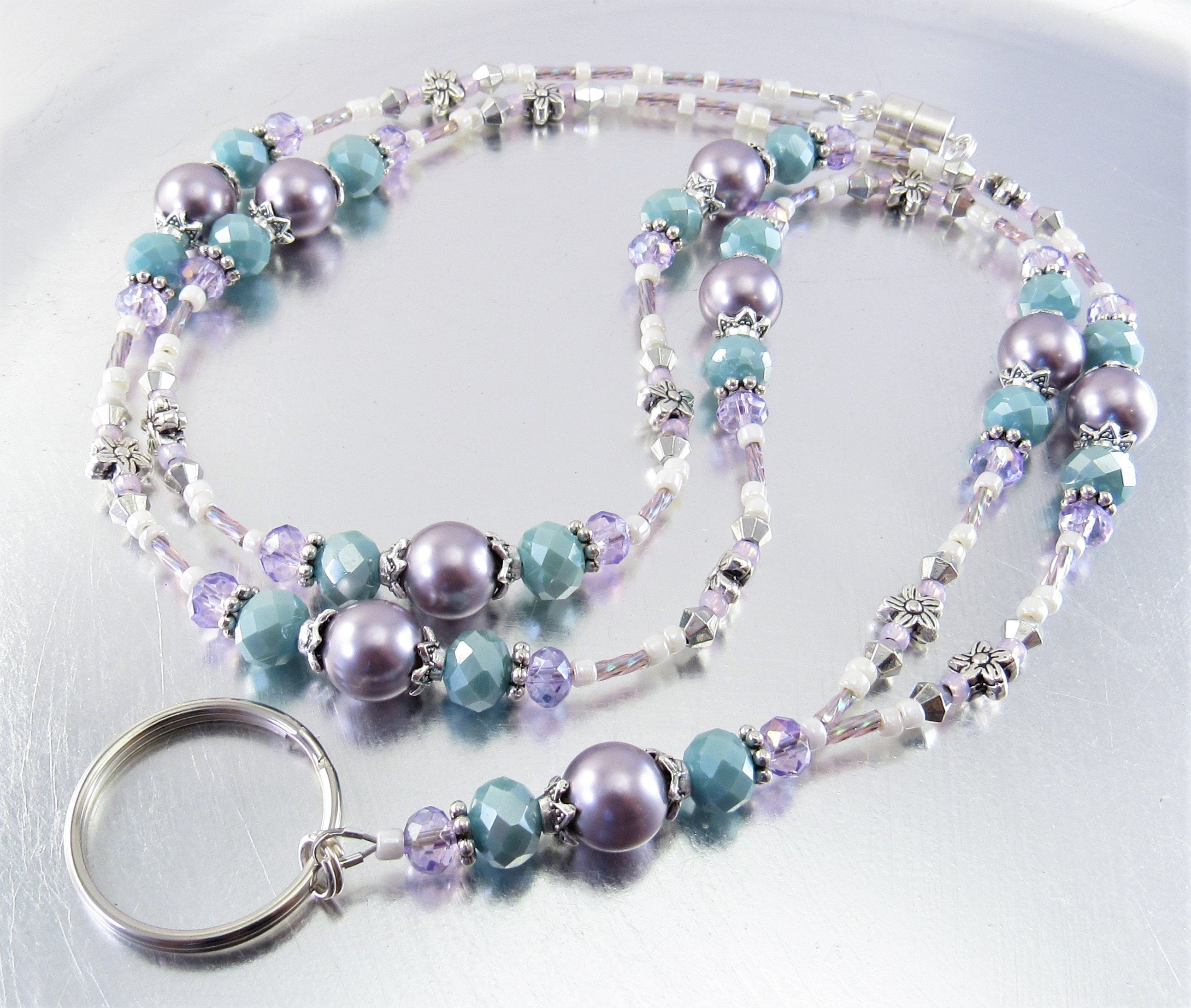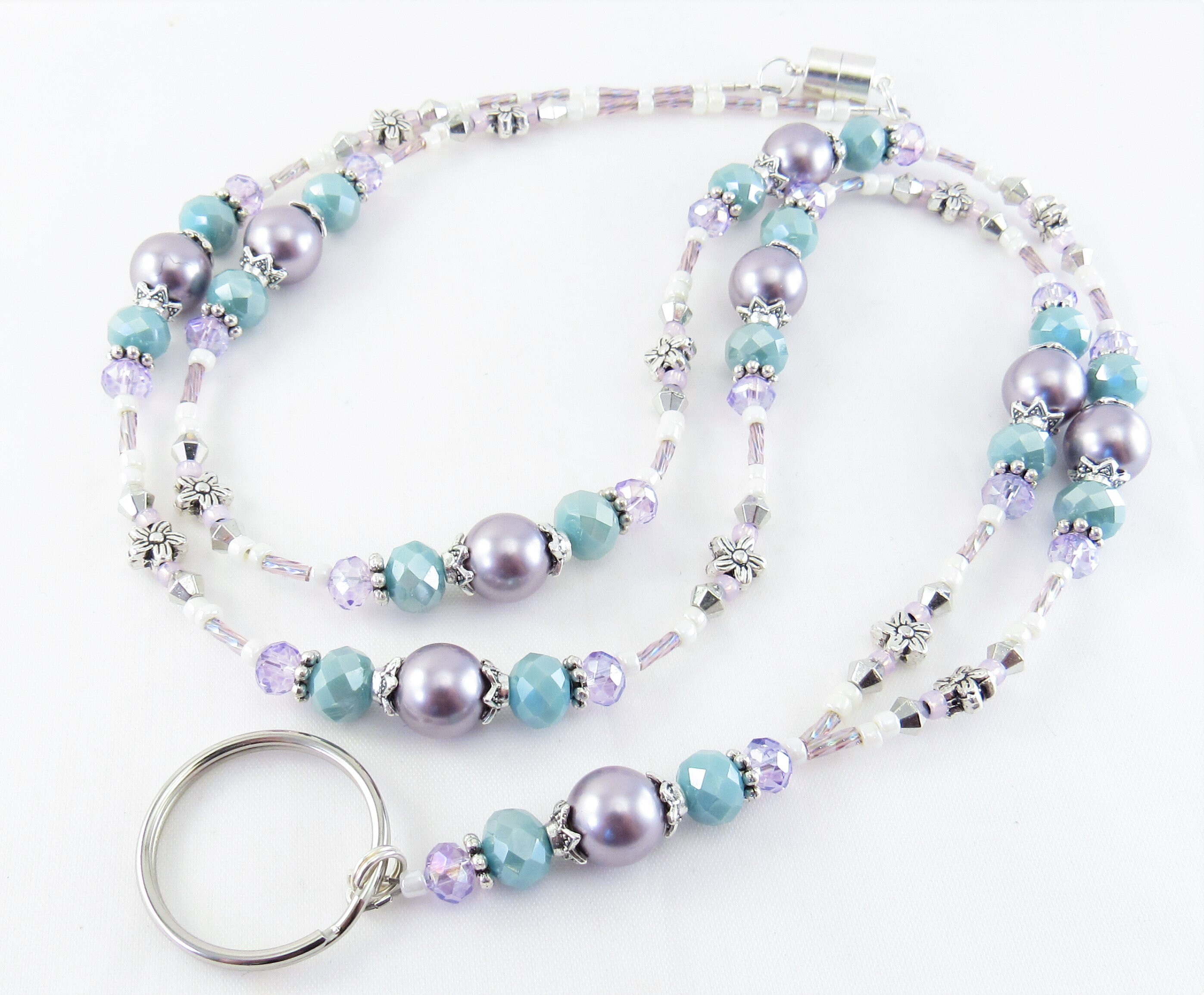 This is a stunning, sparkling ID lanyard that reminds me of Spring. I used an assortment of beautiful beads including 10mm mauve Swarovski Crystal Pearls, 6x8mm light blue faceted Czech glass beads, 4mm faceted purple crystal glass beads, silver plated flowers, bicone shaped spacers and bead caps, pastel cream and purple glass seed beads and purple rainbow twisted glass bugle beads.